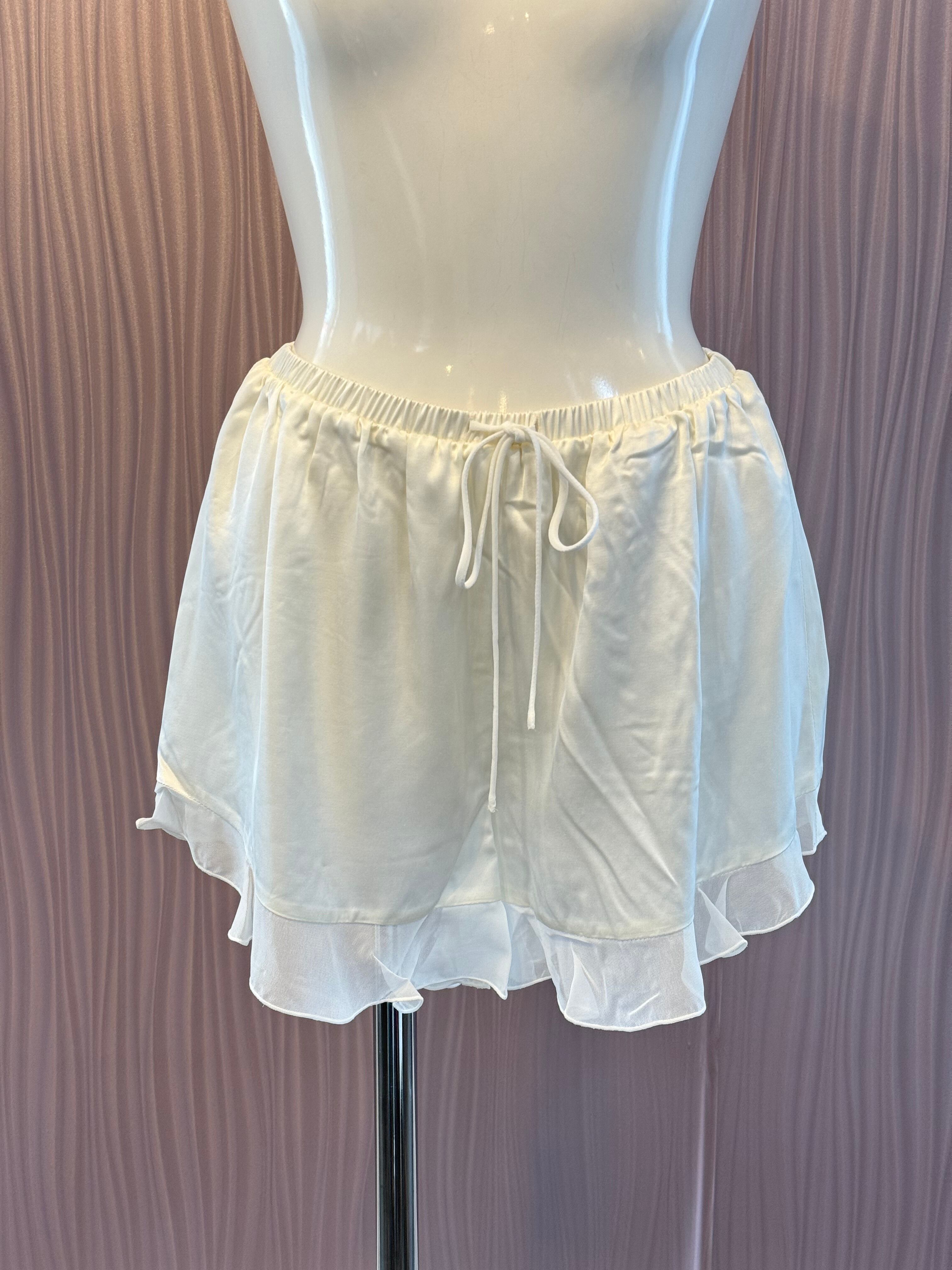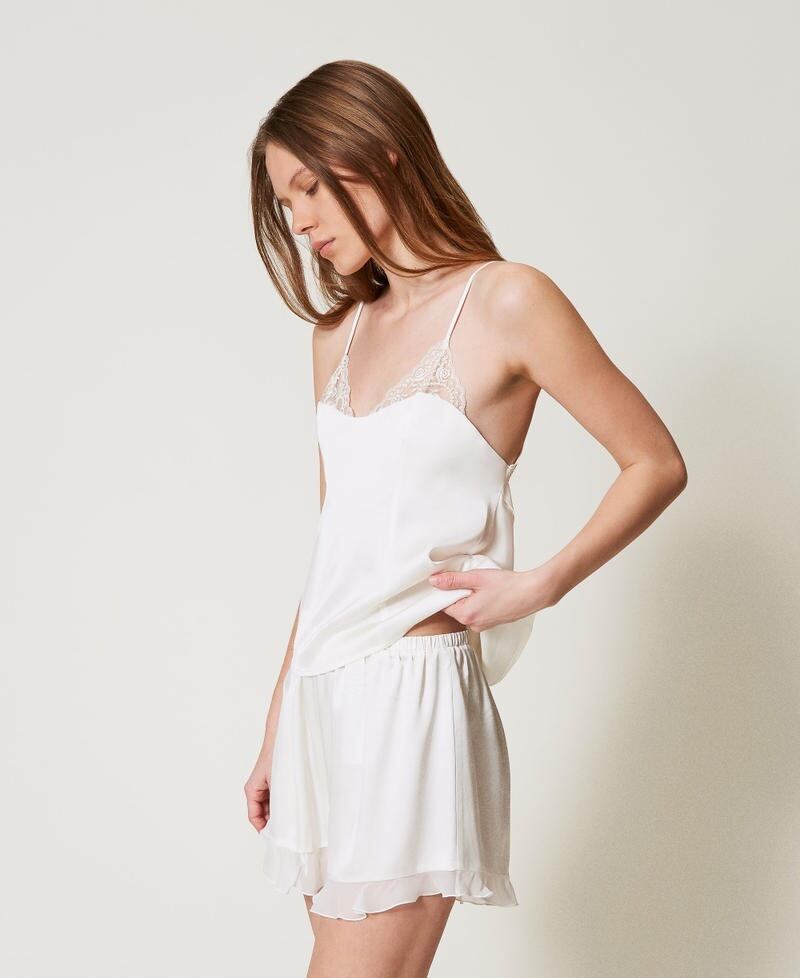 ビスコースサテンのトップスとショートパンツのパジャマ。調節可能な細いショルダーストラップ、スカラップレースのネックライン、バックの留め具で開閉、ハート型のロゴと深いV字のネックライン、ストレートフィット。ショーツはドローストリング入りのゴムウエストで、裾にジョーゼットのシースルーフラウンスがあしらわれています。