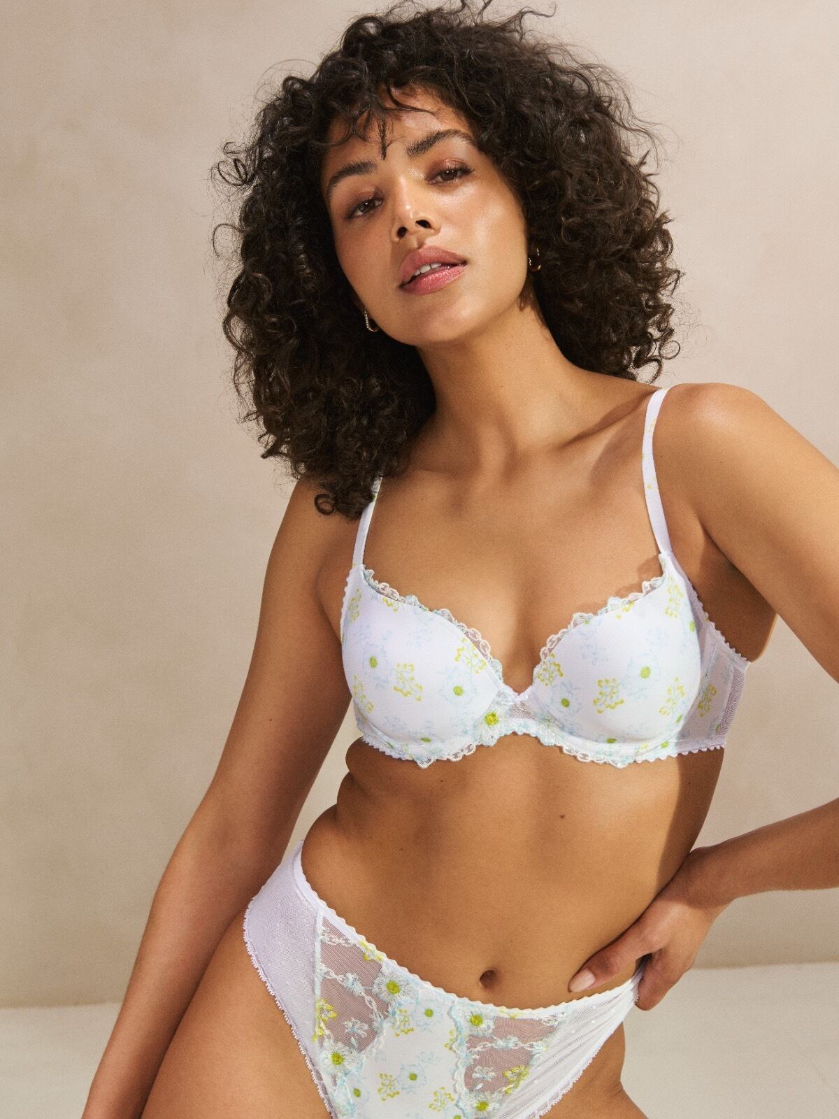 花柄プリントと刺繍の組み合わせは、ランジェリーに詩的な繊細さを加え、