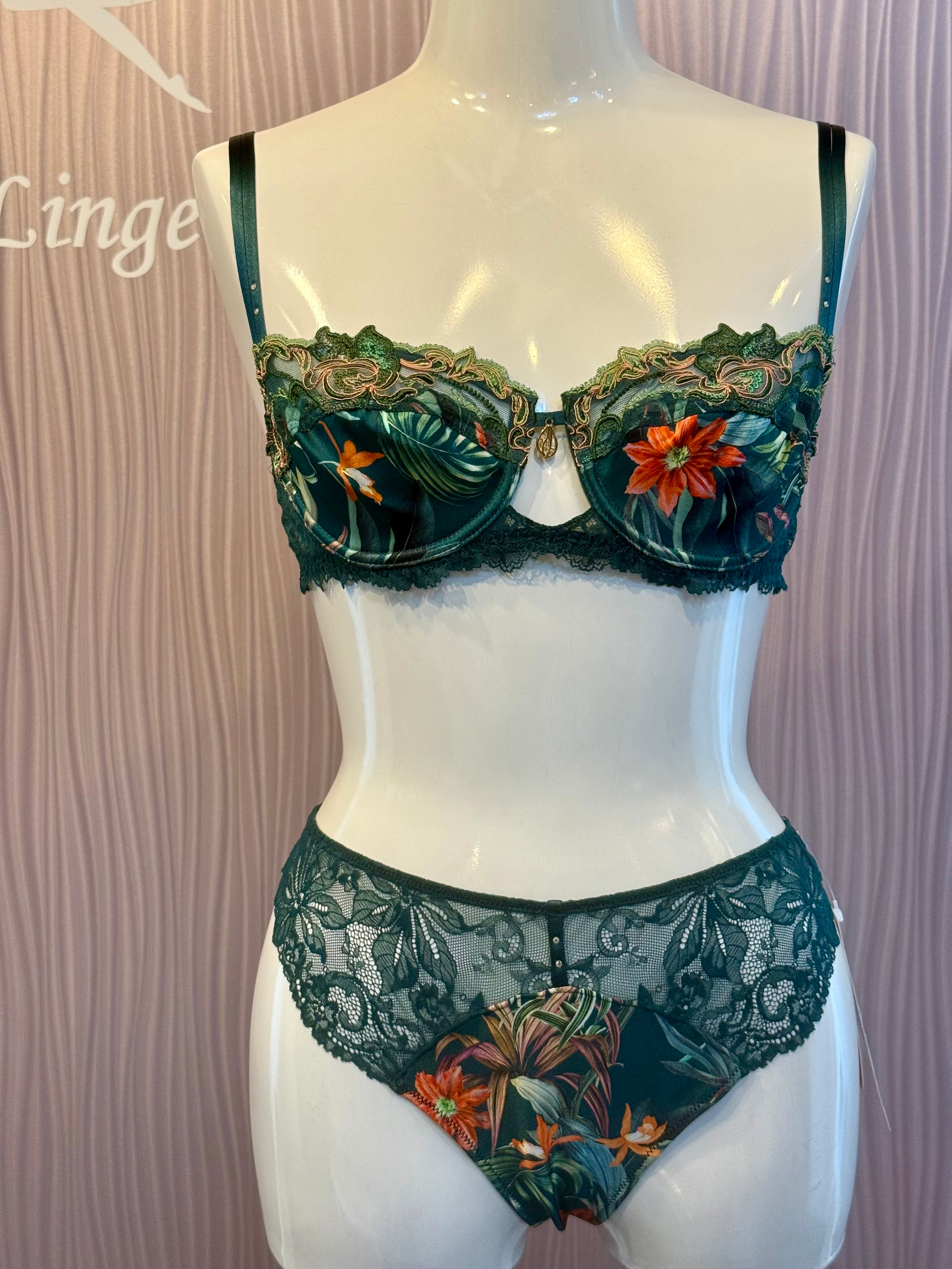 ブラジャーのアンダー部とボトムには、透かし細工と網目模様の遊びで活氣を与える繊細で