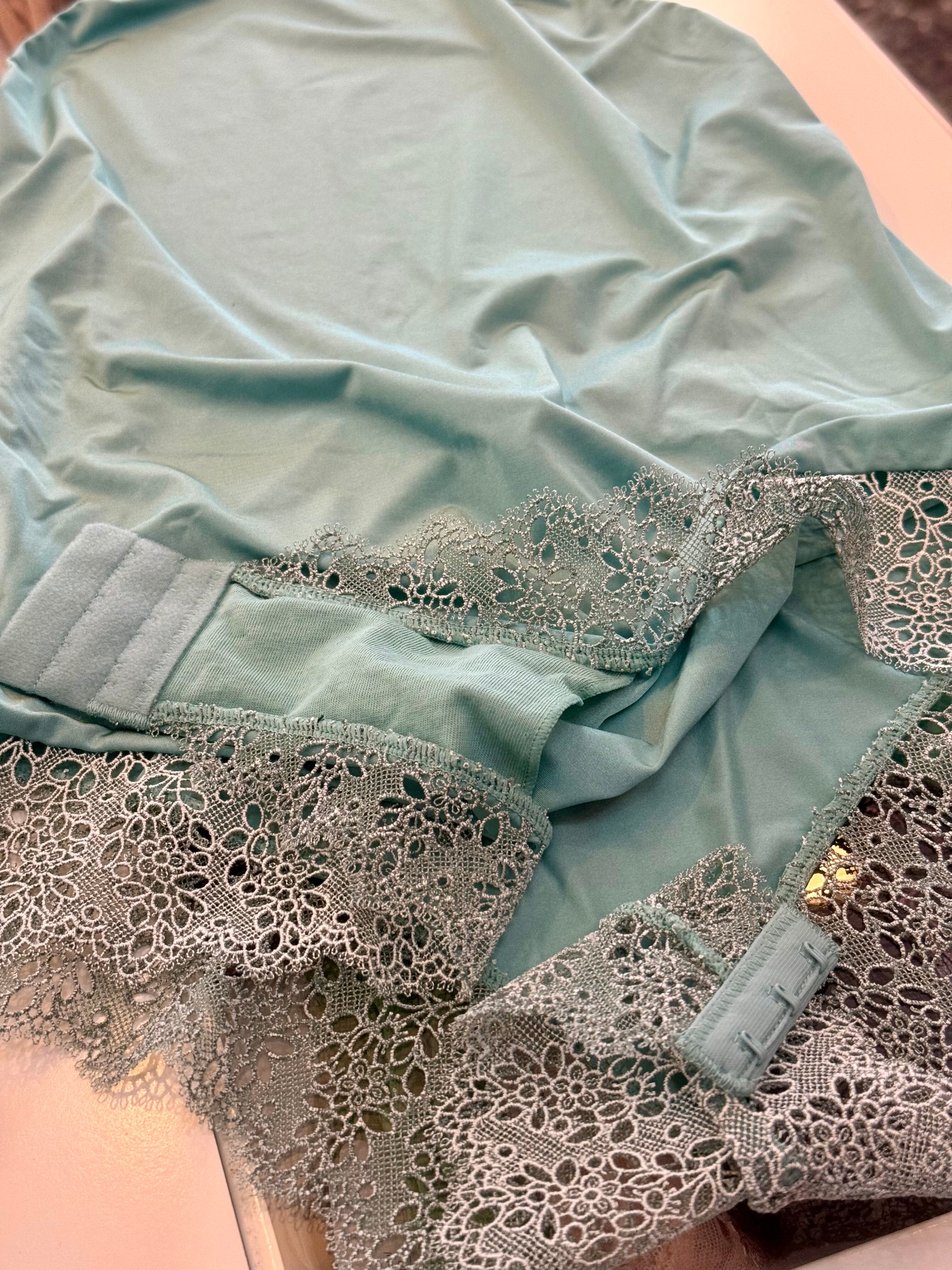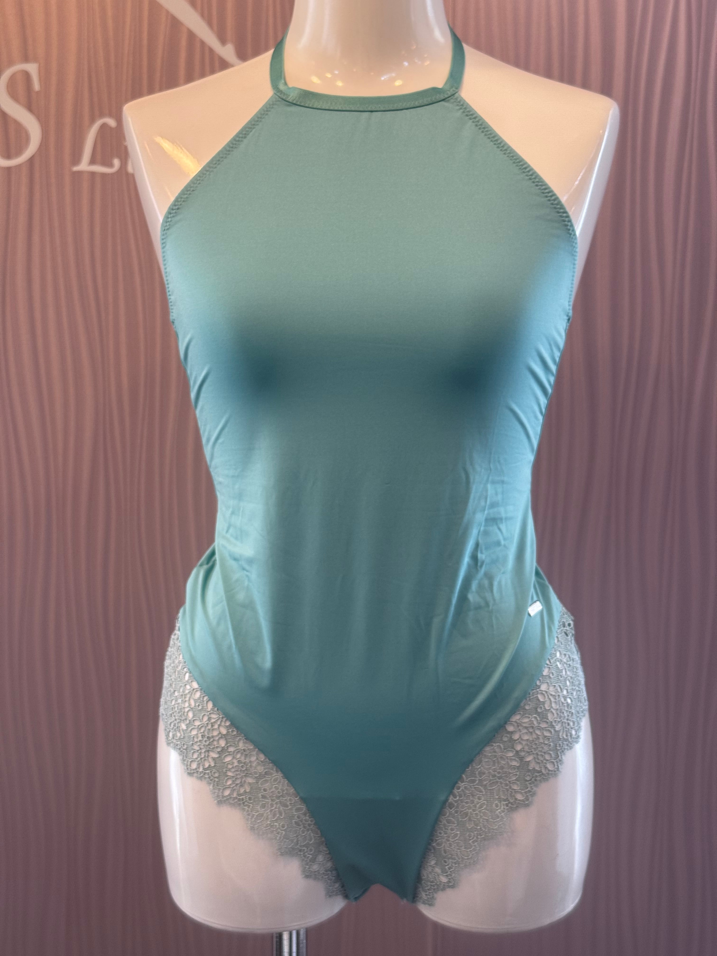 マクラメシリーズのボディスーツは、柔らかく滑らかなマイクロファイバー製で、マクラメレースのインサートがエレガントでフェミニンな透け感を演出し、シルエットを引き立てます。パッドなし、首の後ろに留め具付き。