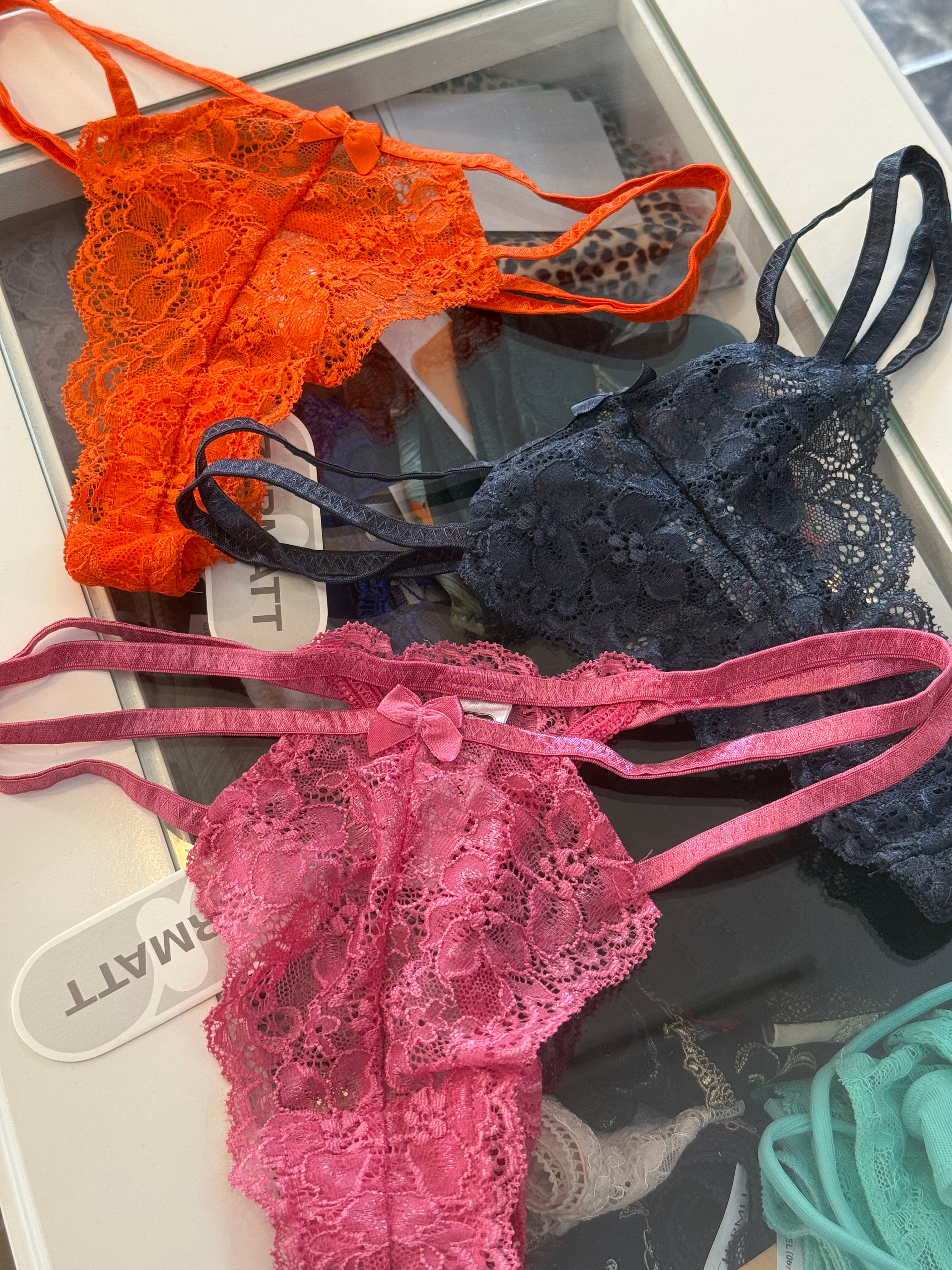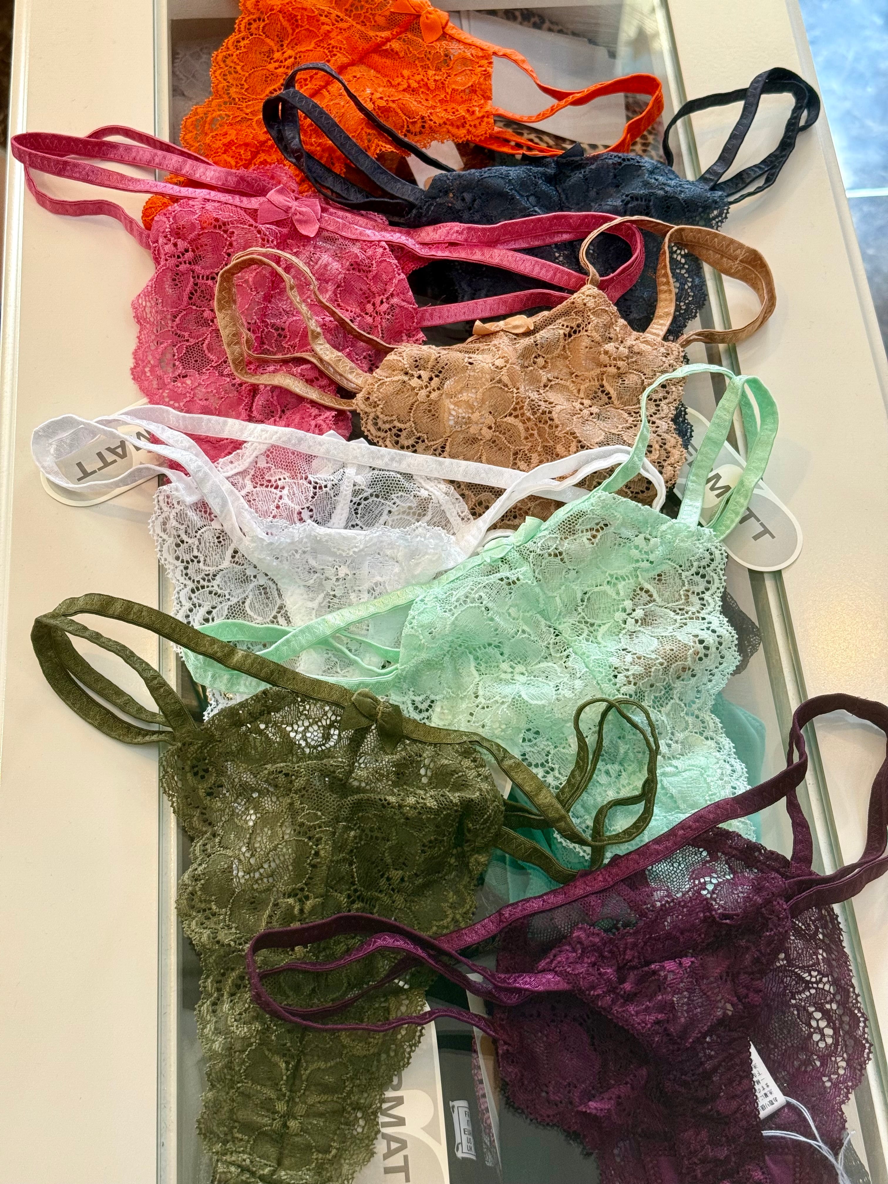 ●お洒落なレースの前見頃を、両サイドからマイクロテープで結んだ大胆なデザイン