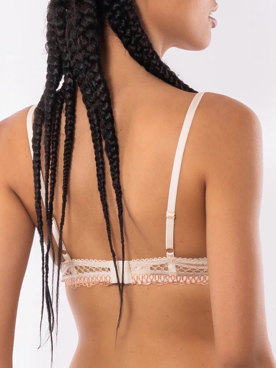 アンダーワイヤーがしっかりサポートし、ストライプの幾何学模様とコントラストカラーのスーパーストレッチレースがモダンで洗練された印象を与えます。