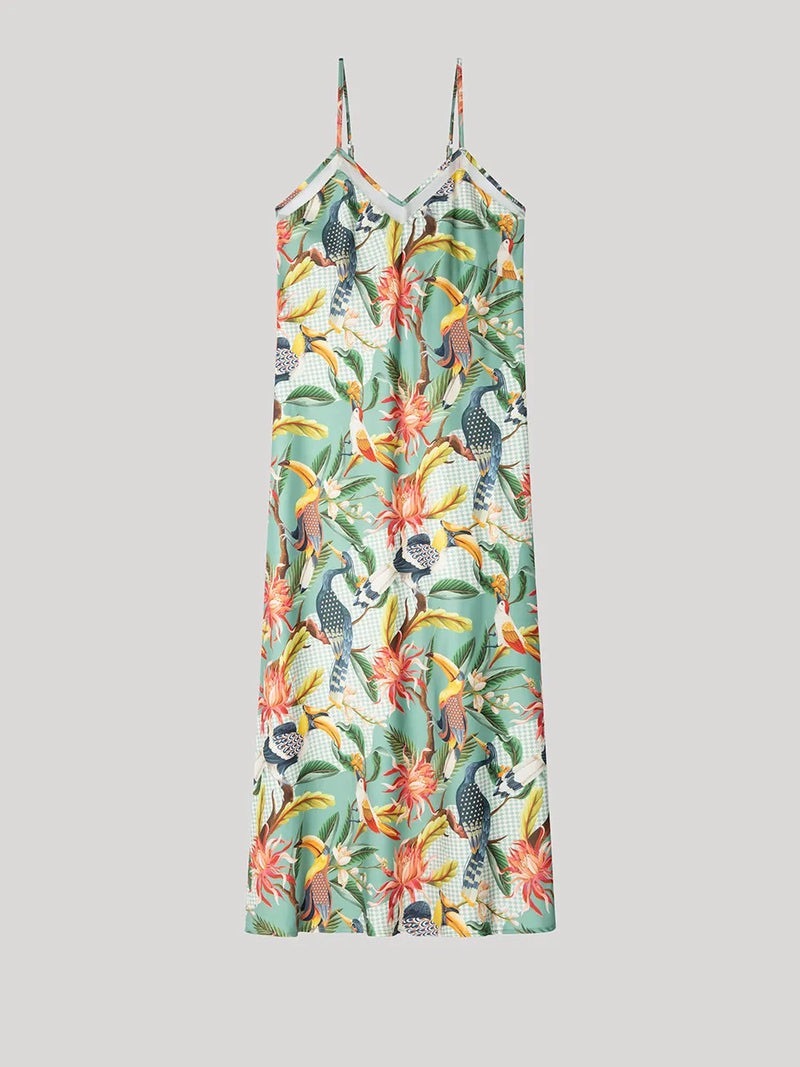 調節可能な細いストラップ付きサテン製ミディ丈ナイトドレス。