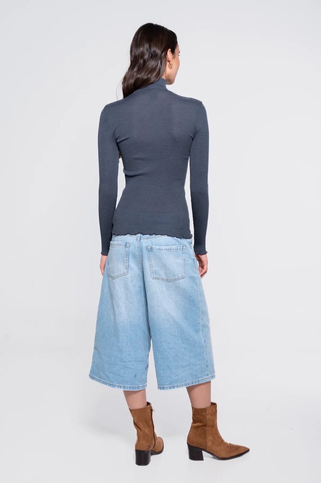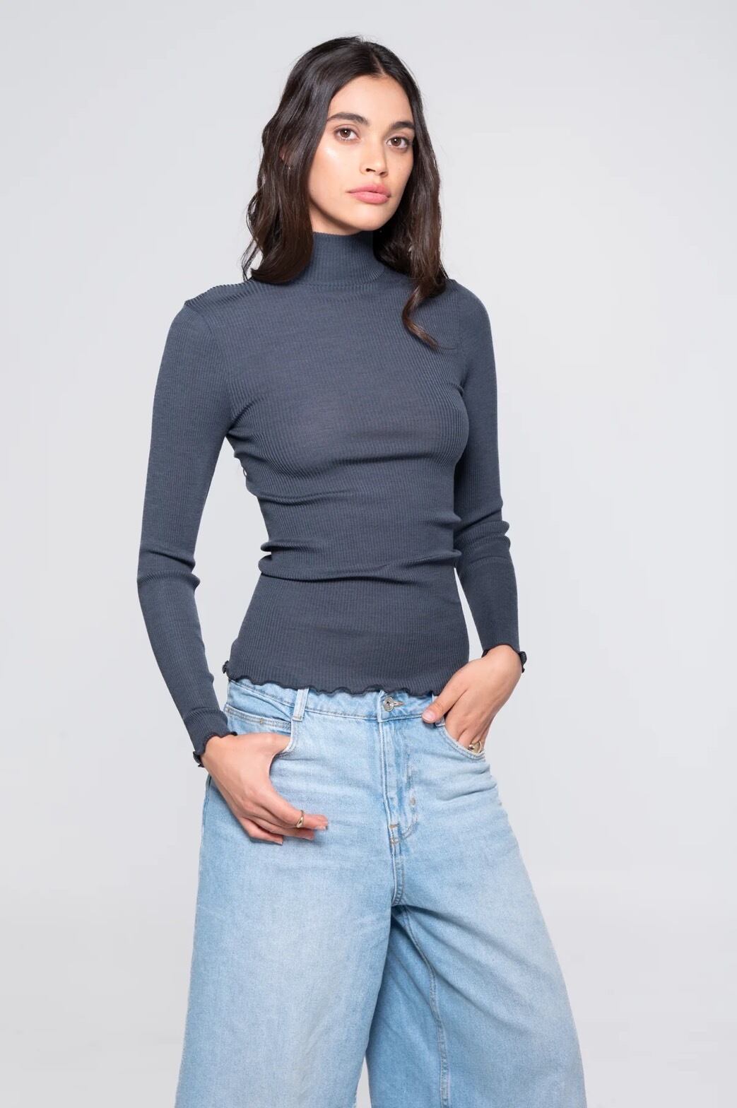 ロングスリーブのモックタートルネック。貴重な天然素材であるメリノ超細羊毛と最高級純絹をブレンドした肌触りの良い生地を使用。