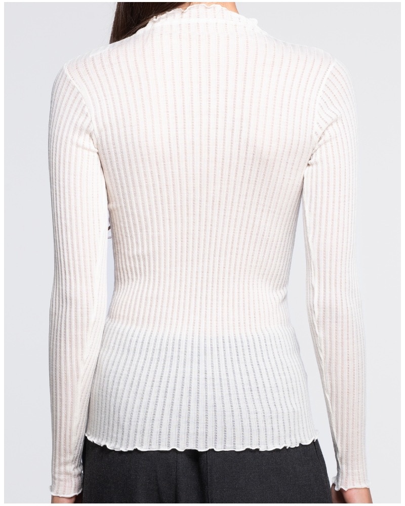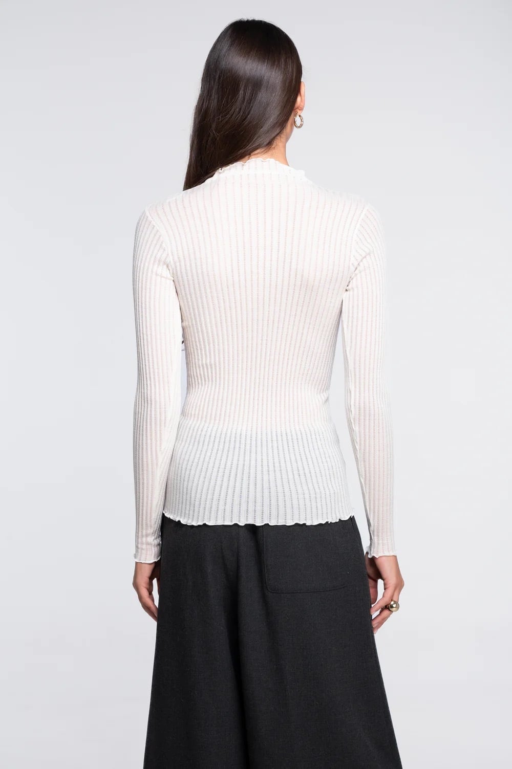 ロングスリーブのモックネックトップ。メリノ超極細ウールと最高級純絹をブレンドした繊細なアジュールリブニット生地を使用。身体に優しくフィットし、独特の透け感が上品な印象を際立たせます。サイドシームレス構造により、肌に温かく柔らかな肌触りと、最高の着心地を実現。