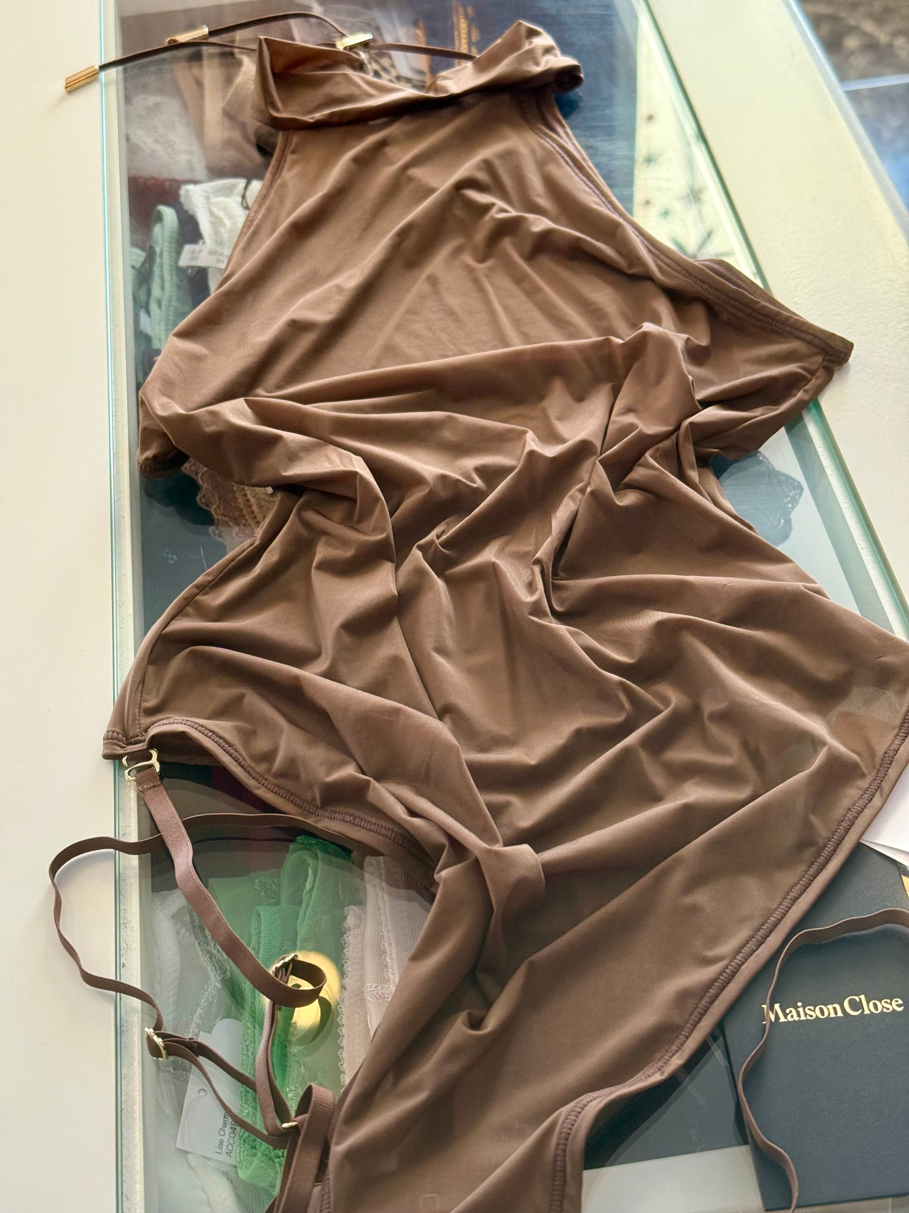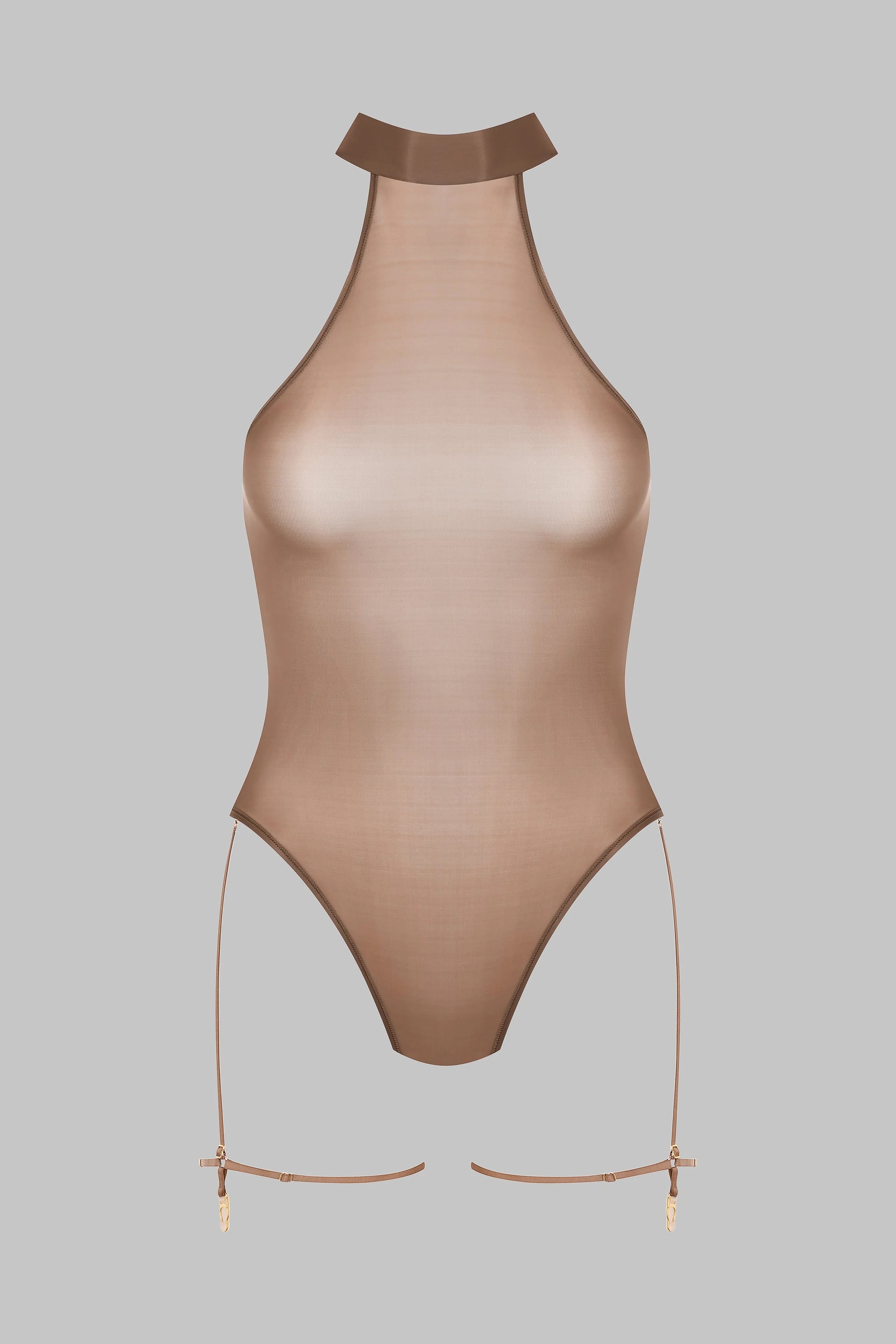 ハイネックは繊細なシャーリングレースで開き、ユニークなスライダーとメゾン・クローズのサイン入りゴールドのリップスティック・アクセサリーで調節可能。ゴールドのアクセサリーが付いた取り外し可能な2本のガーター、ルックを格上げします。