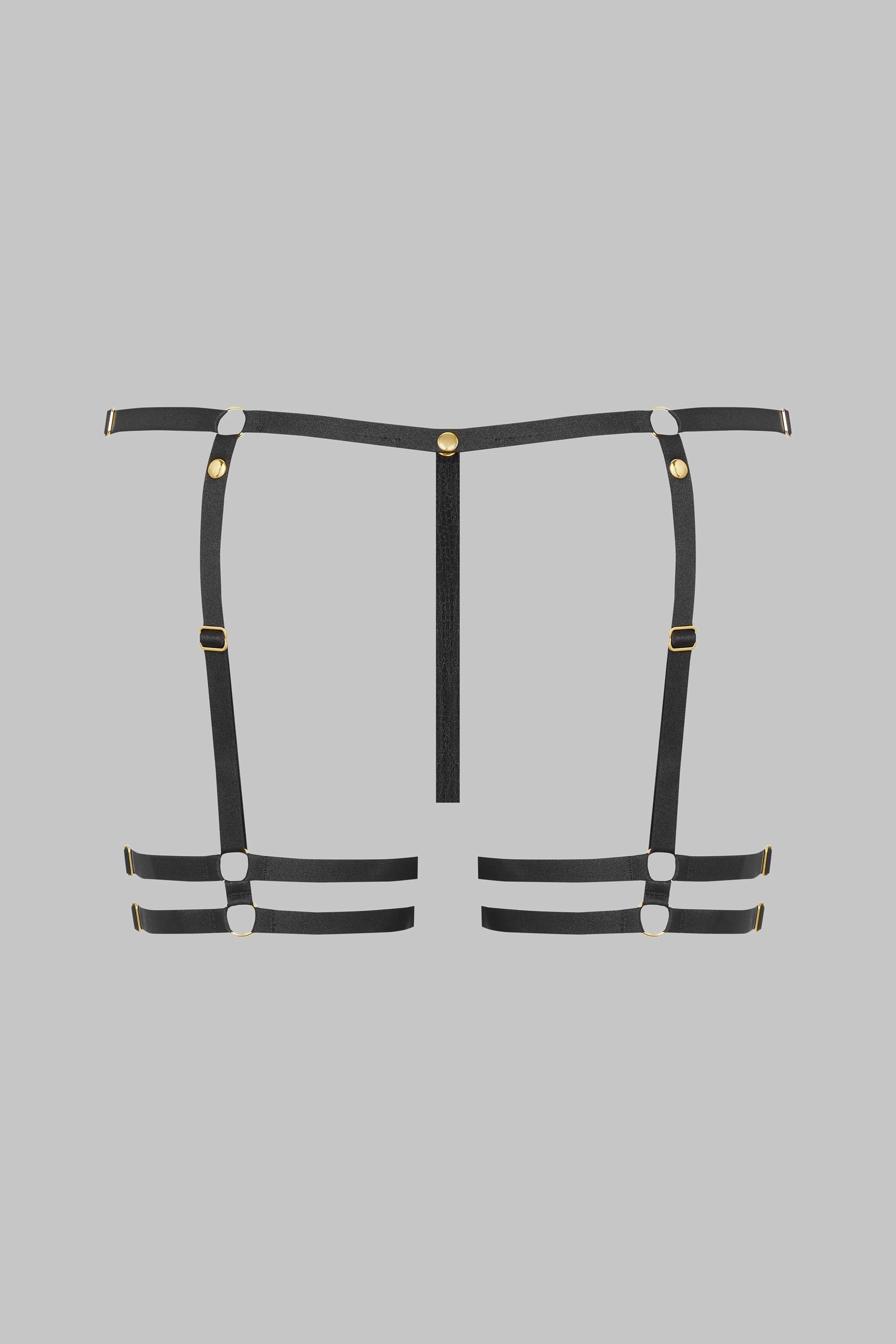 ガーターは金色のマグネットボタンで留める。フィット感は両サイドの金色の留め金で調整可能。背面の磁氣ボタンでTバックを完全に開くことができる。遊び心にあふれ、多様な使い方ができる一品。欲望のリズムに合わせてデザインされている。