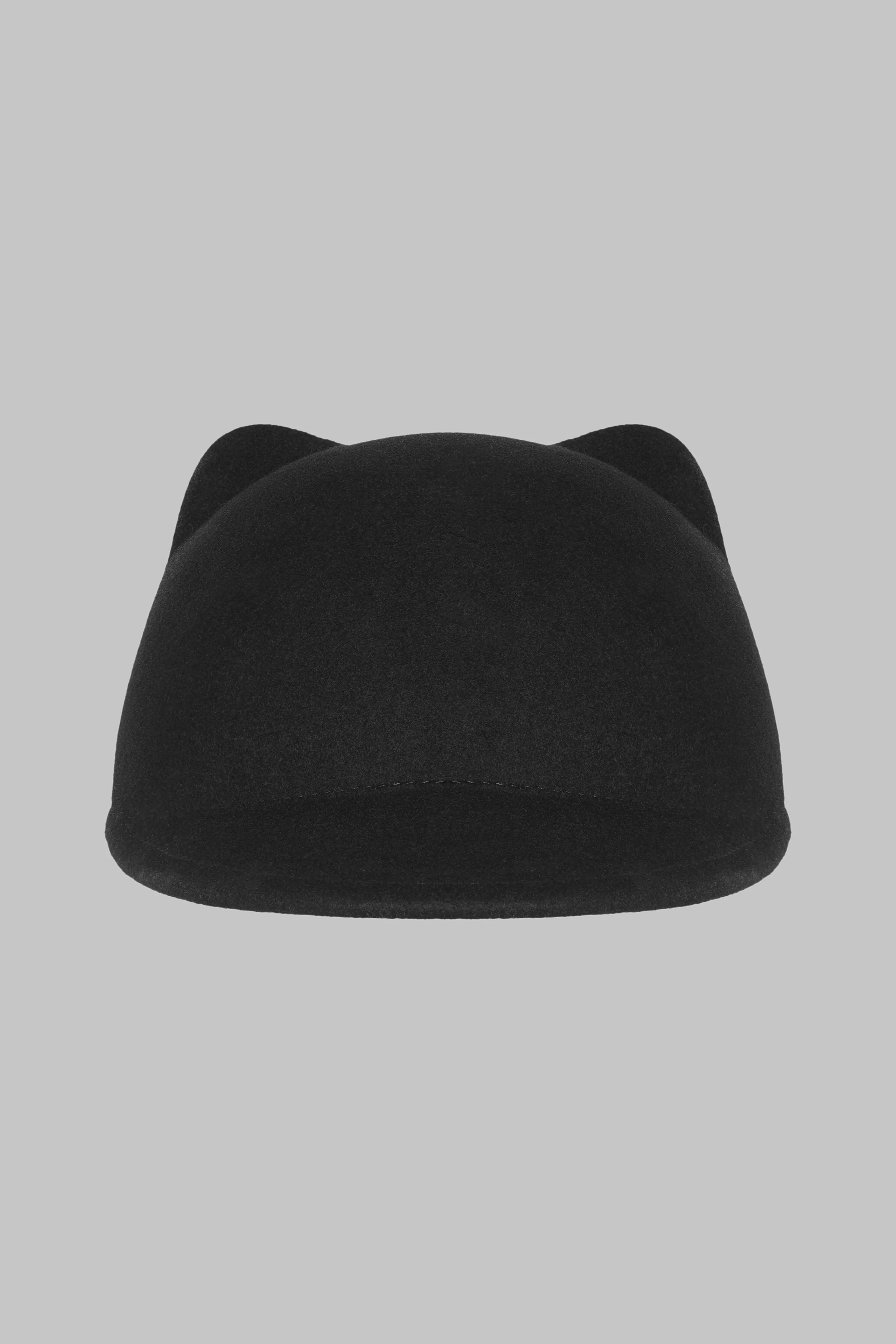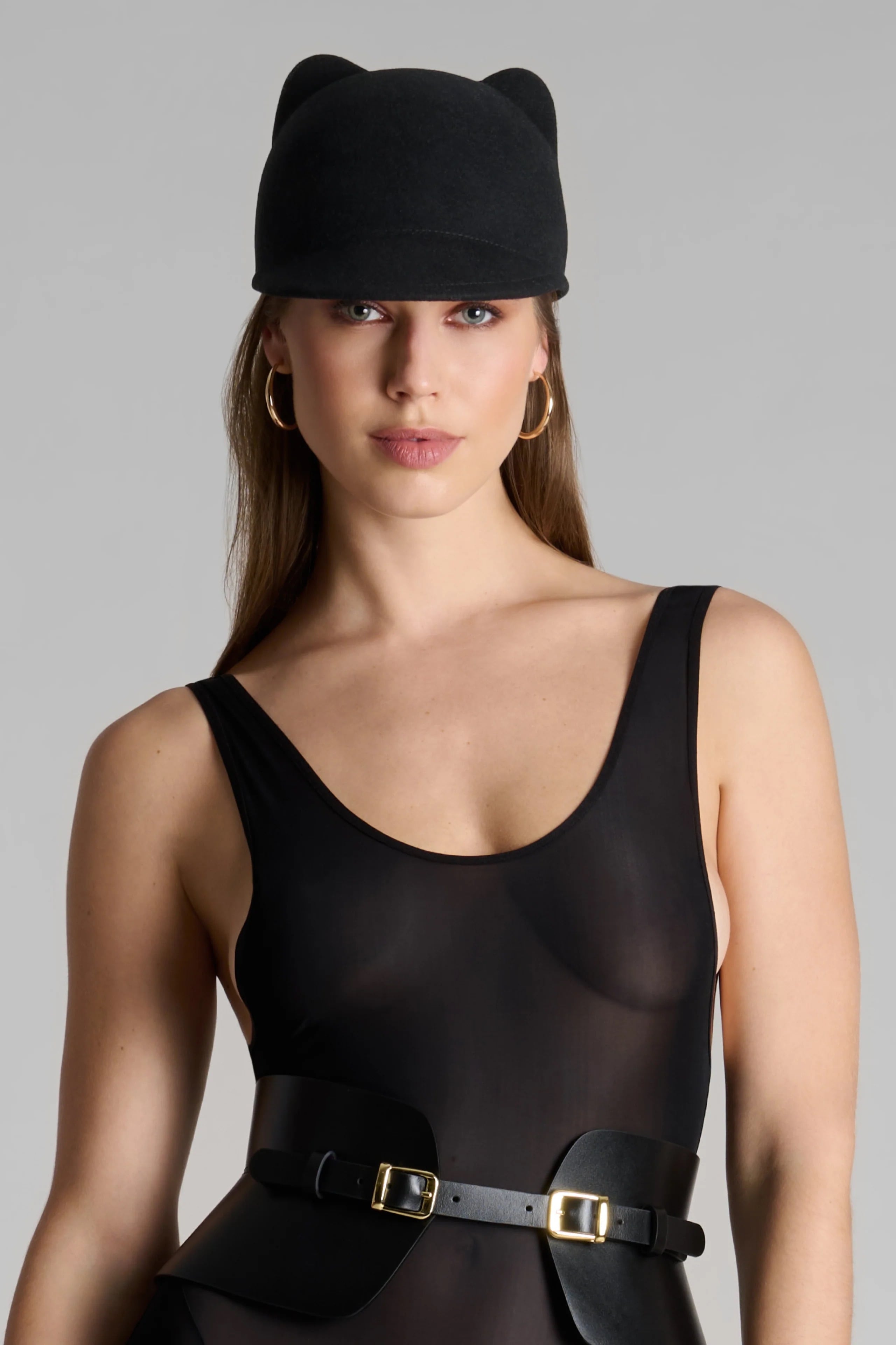キャットハットは遊び心と洗練を兼ね備えた一品。短いつばと二つの猫耳が、ささやくような秘密を呼び起こし、無垢と大胆さの二面性を表現する。黒のウールで仕立てられた内部には、メゾンクローズのシグネチャーカラーである紫のグログランリボンが隠され、控えめでありながら主張のあるアクセントを添える。