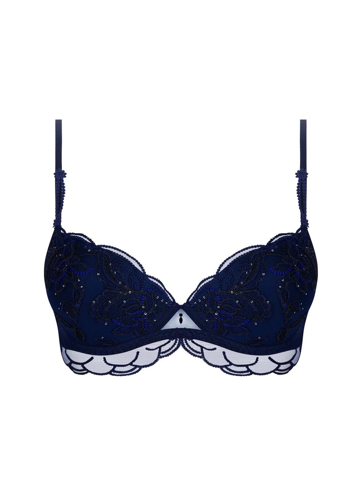 スパンコール刺繍のパッド入りカップ、フロント中央は透け感のあるチュール、チュールのバスク部分には刺繍入りスカラップバンドをあしらっています。