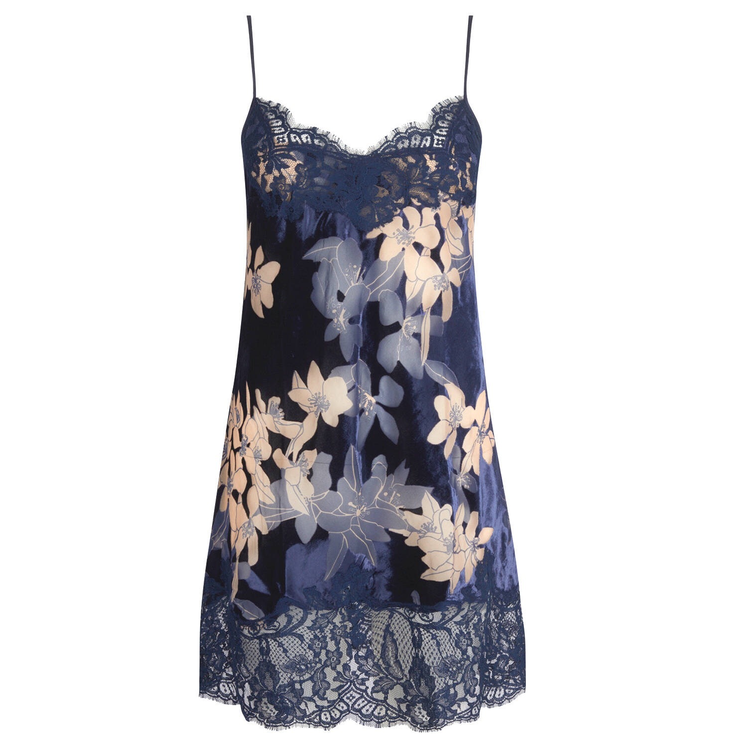 プリントデヴォレベルベットのショートスリップドレス。ネックラインと裾にレースインレイ。細いシルクストラップ。