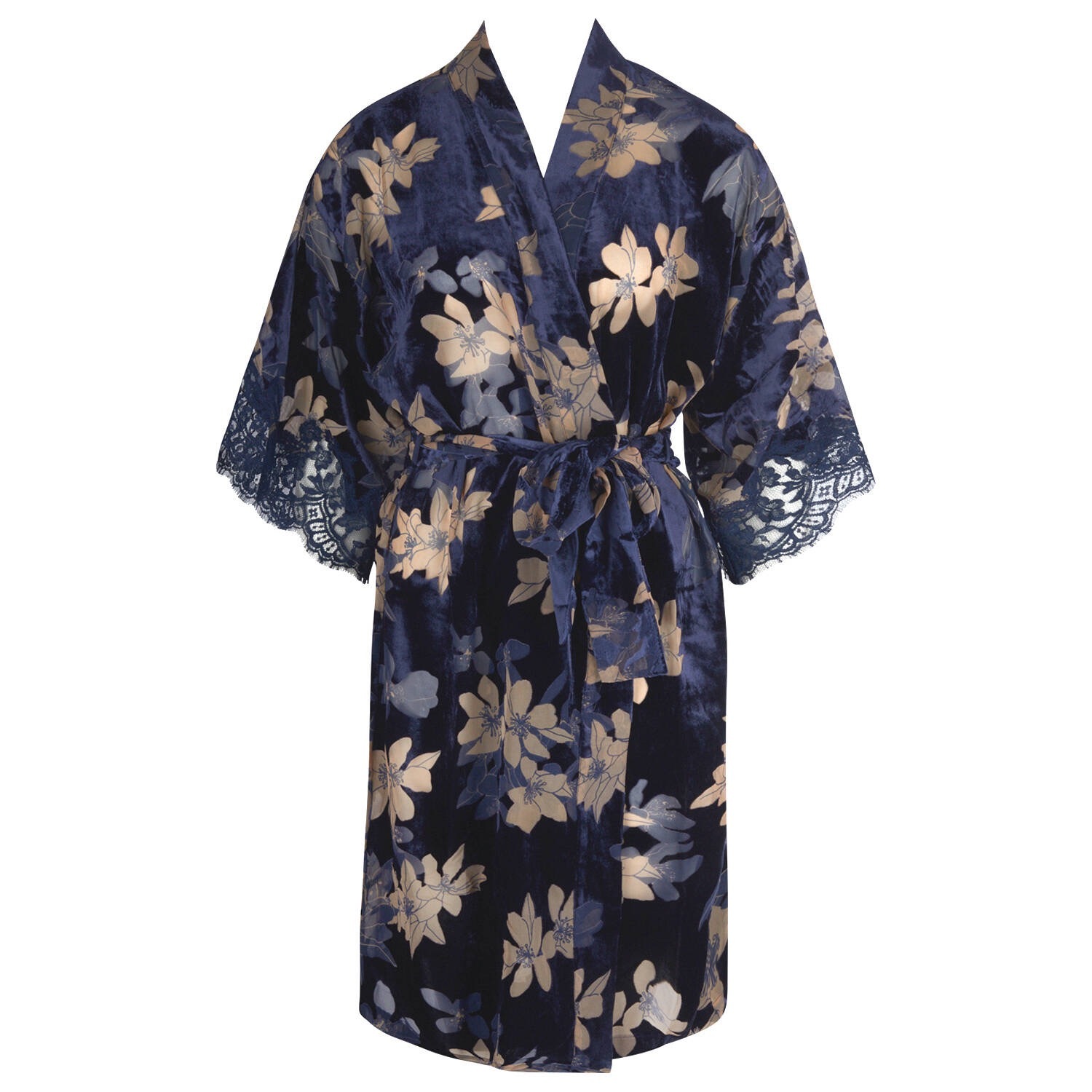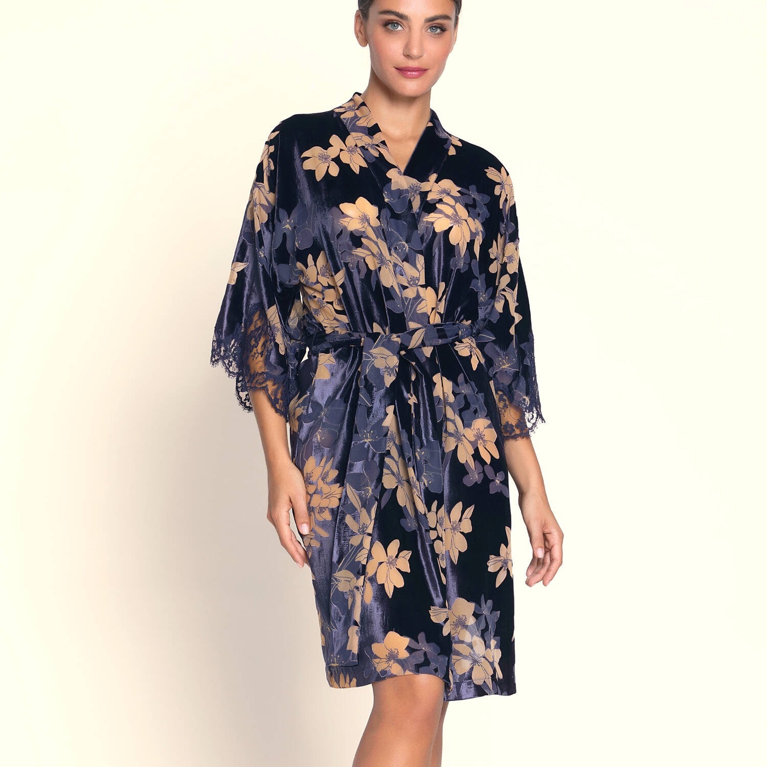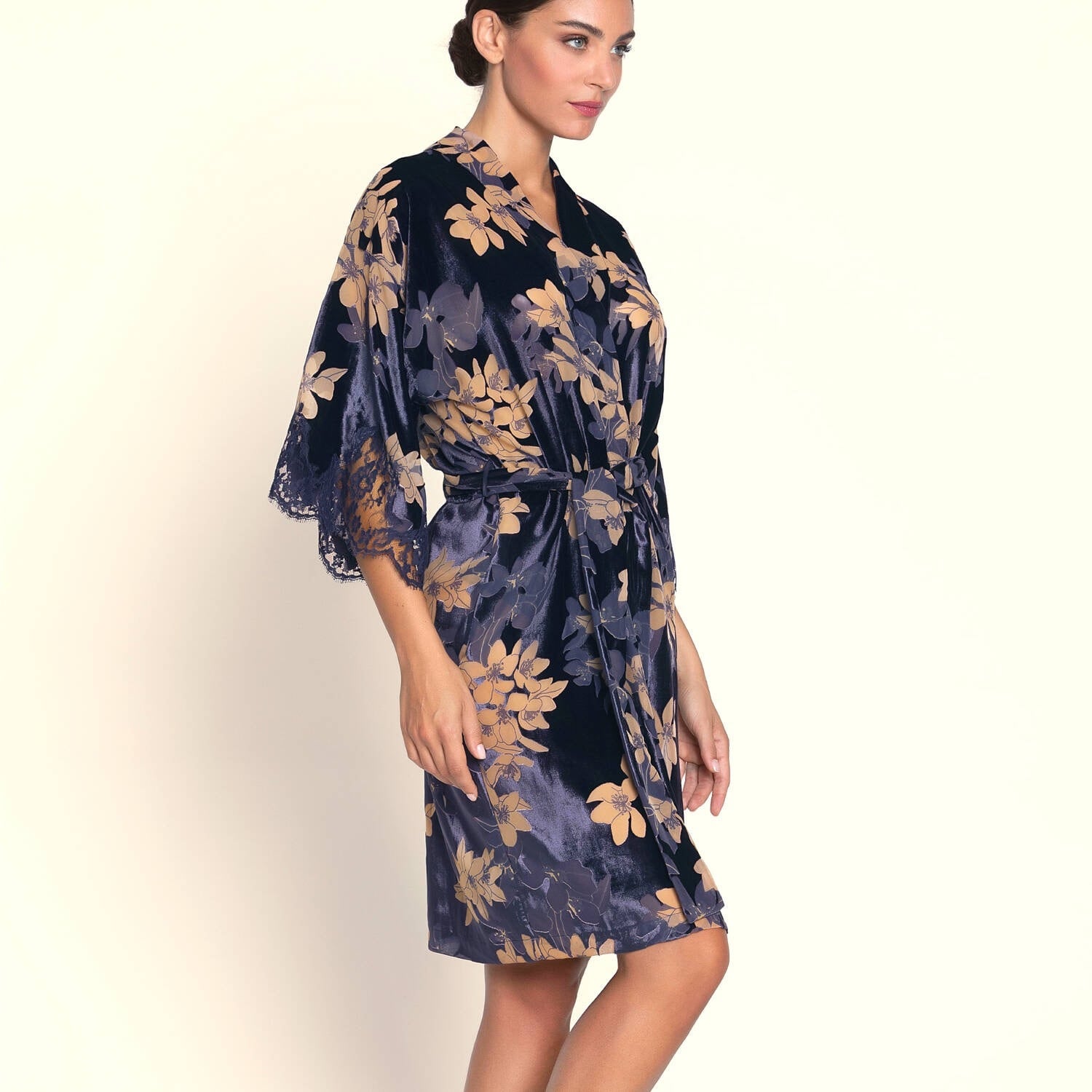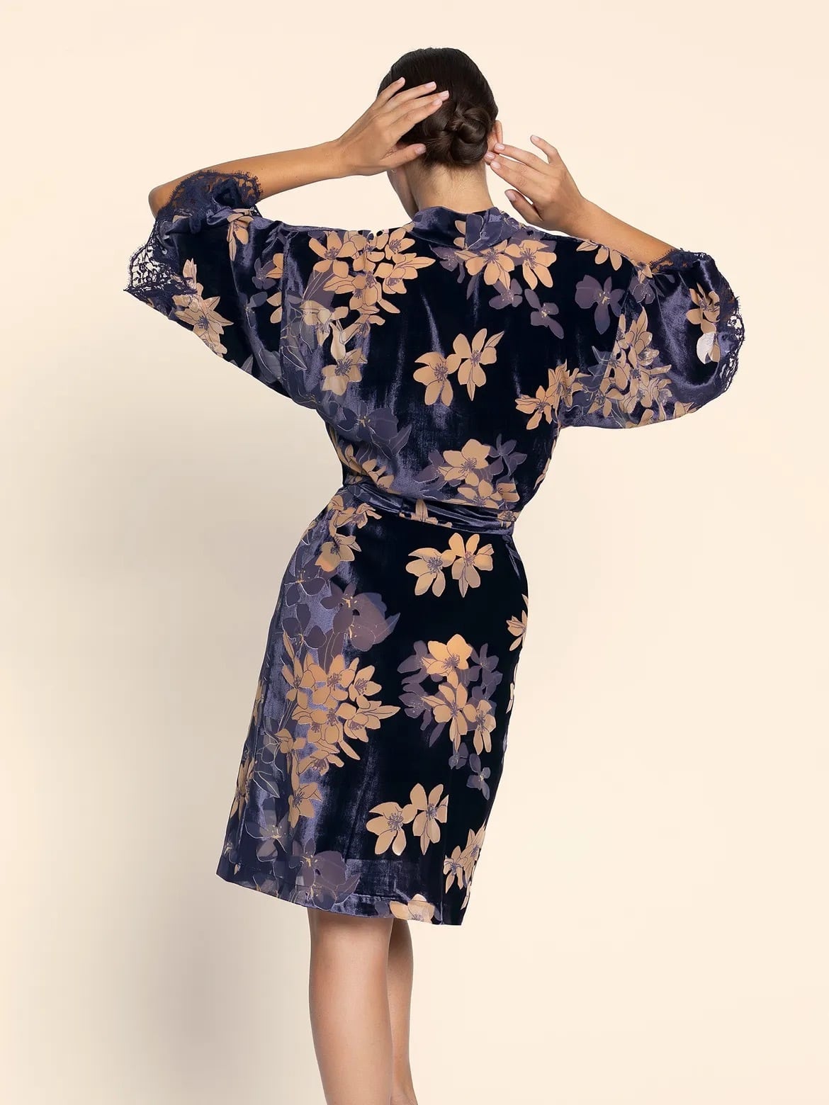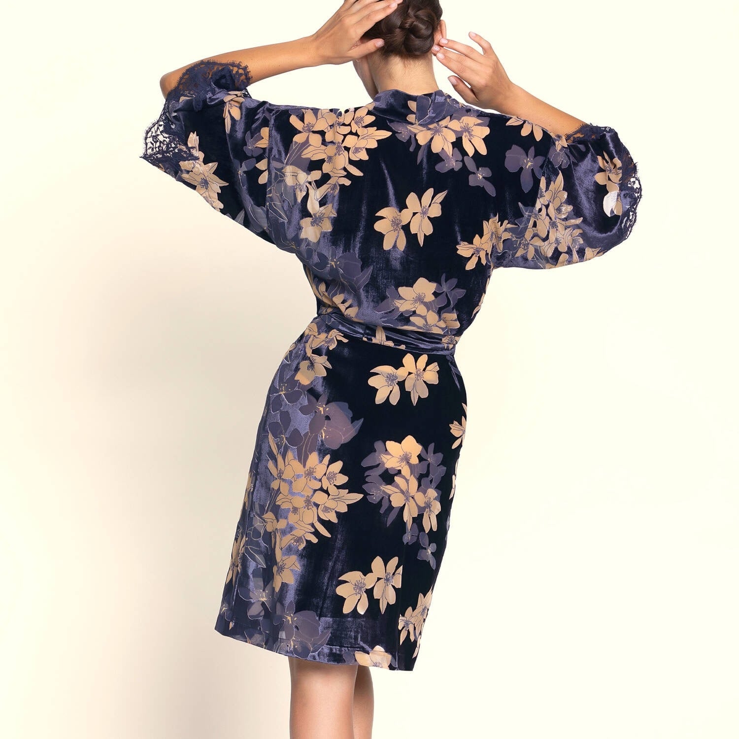 プリントデヴォレベルベットのローブ。袖にレースのインレイを施す。