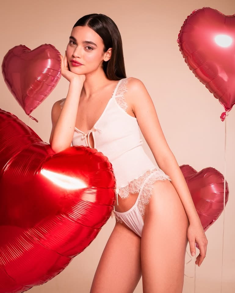 アームホールと裾はシャンティイレースで優雅に縁取られ、洗練された葉のモチーフを際立たせています。