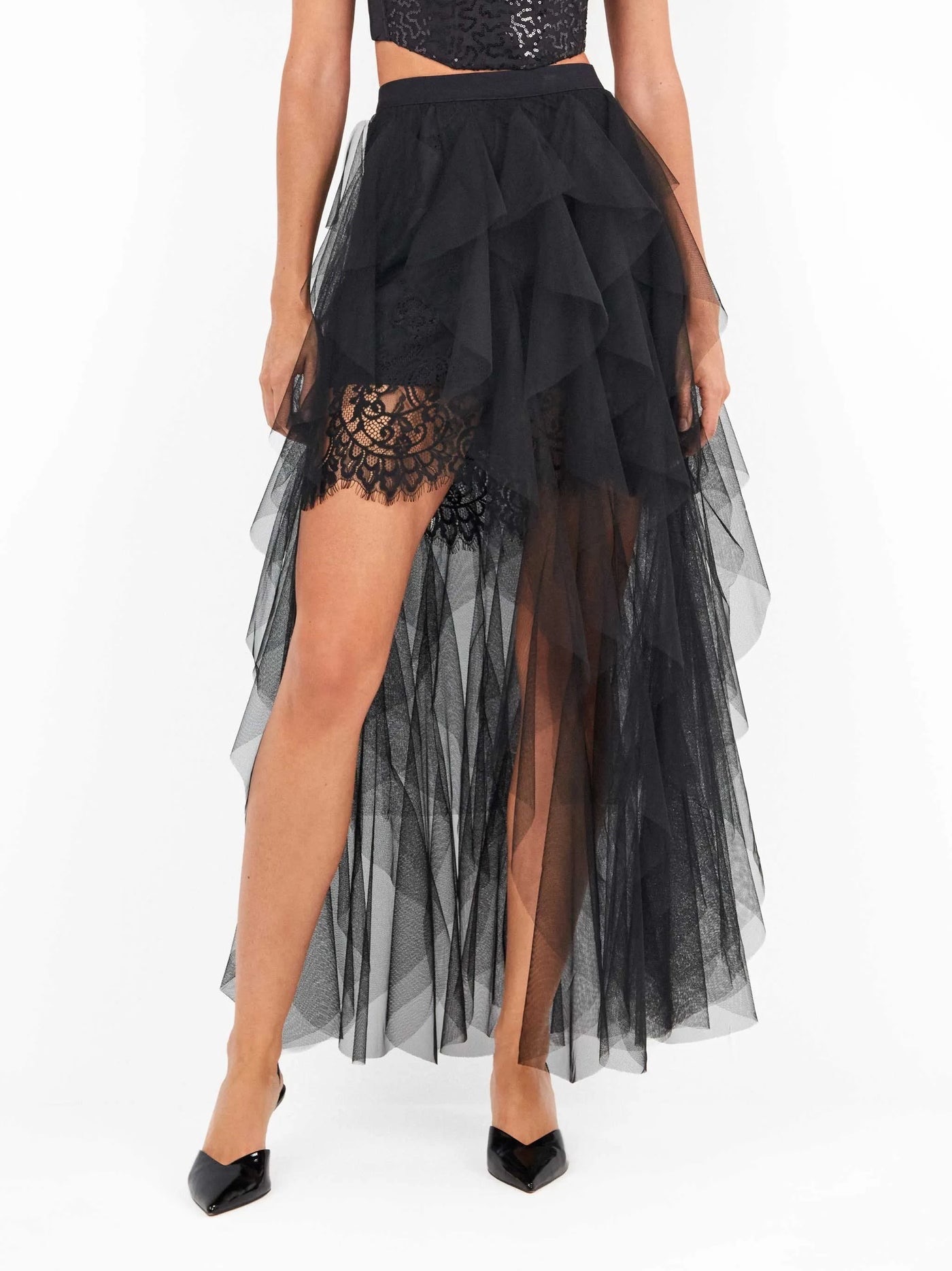 フローラルレースの魅力をチュールの軽やかなカスケードと融合させた、幻想的でロマンチックなデザインのスカート。ミニスカートのような裏地が、透け感のあるレースのディテールを損なうことなく必要なカバー力を提供します。ユニークで洗練された装いで注目を集めたい特別な機会やフォーマルなイベントに最適です。