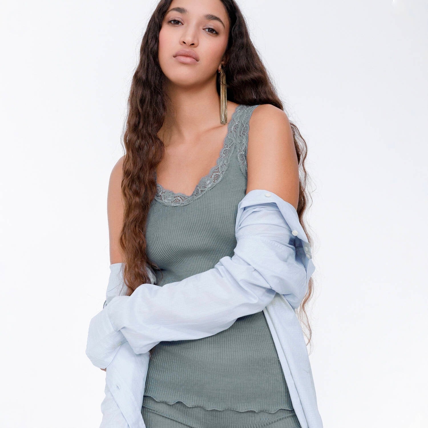 リブ編みのインナーはシワにならず、自然に身体にフィットし、ボディラインをきれいに魅せてくれます。
