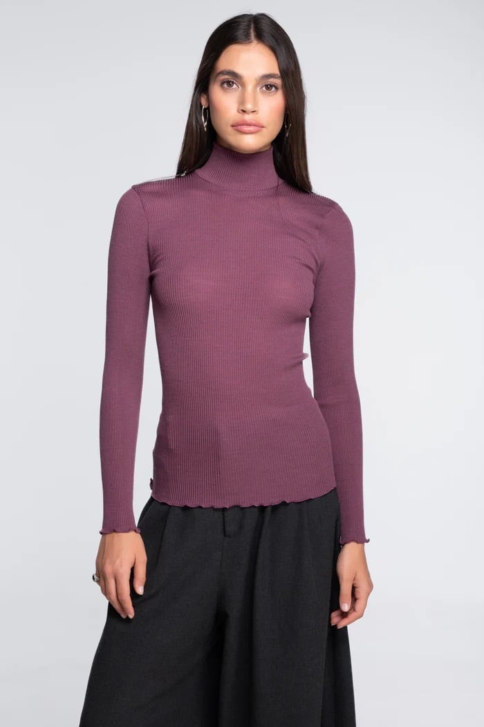 ロングスリーブのモックタートルネック。貴重な天然素材であるメリノ超細羊毛と最高級純絹をブレンドした肌触りの良い生地を使用。
