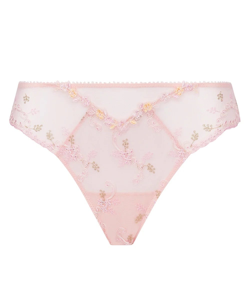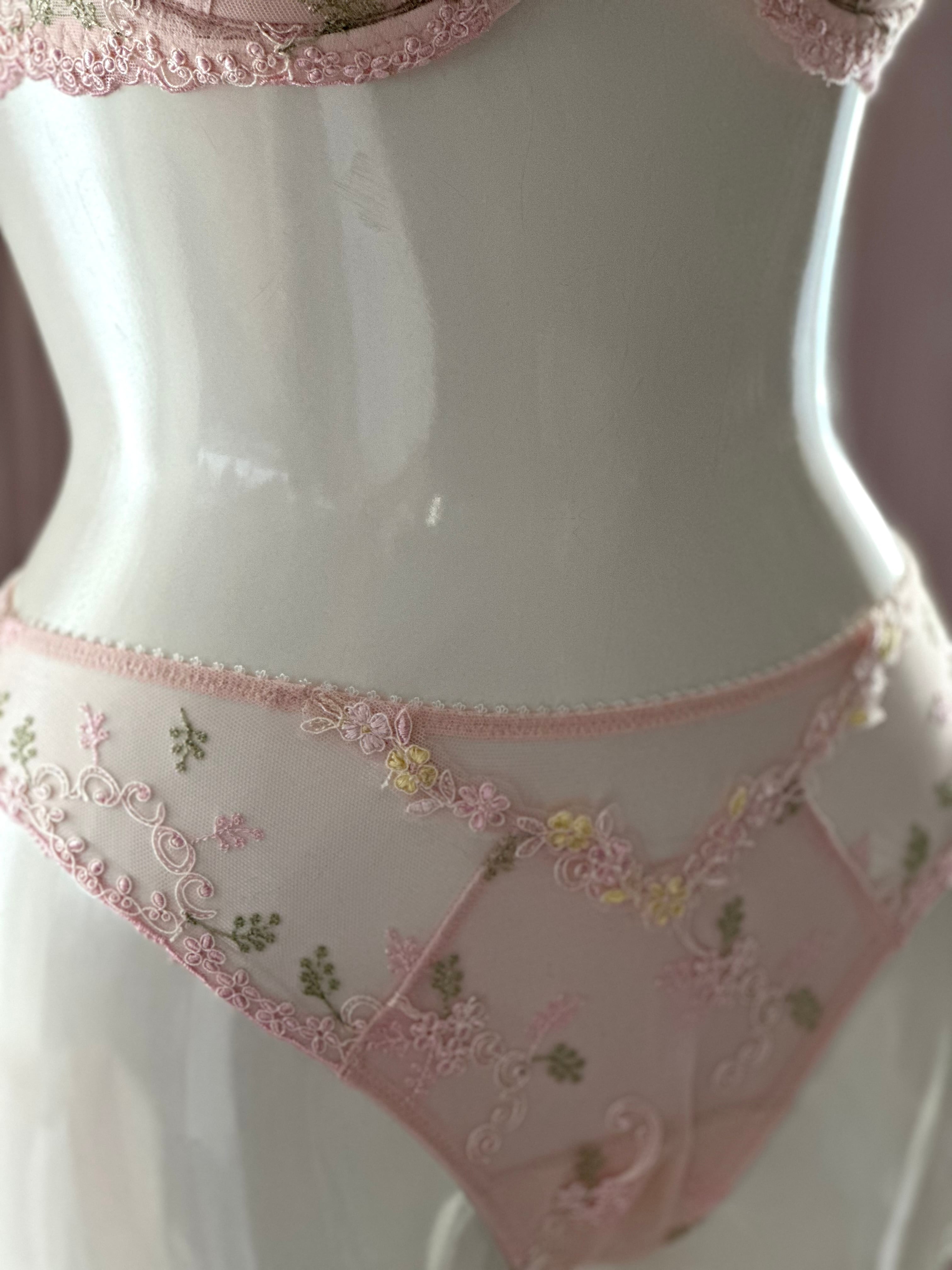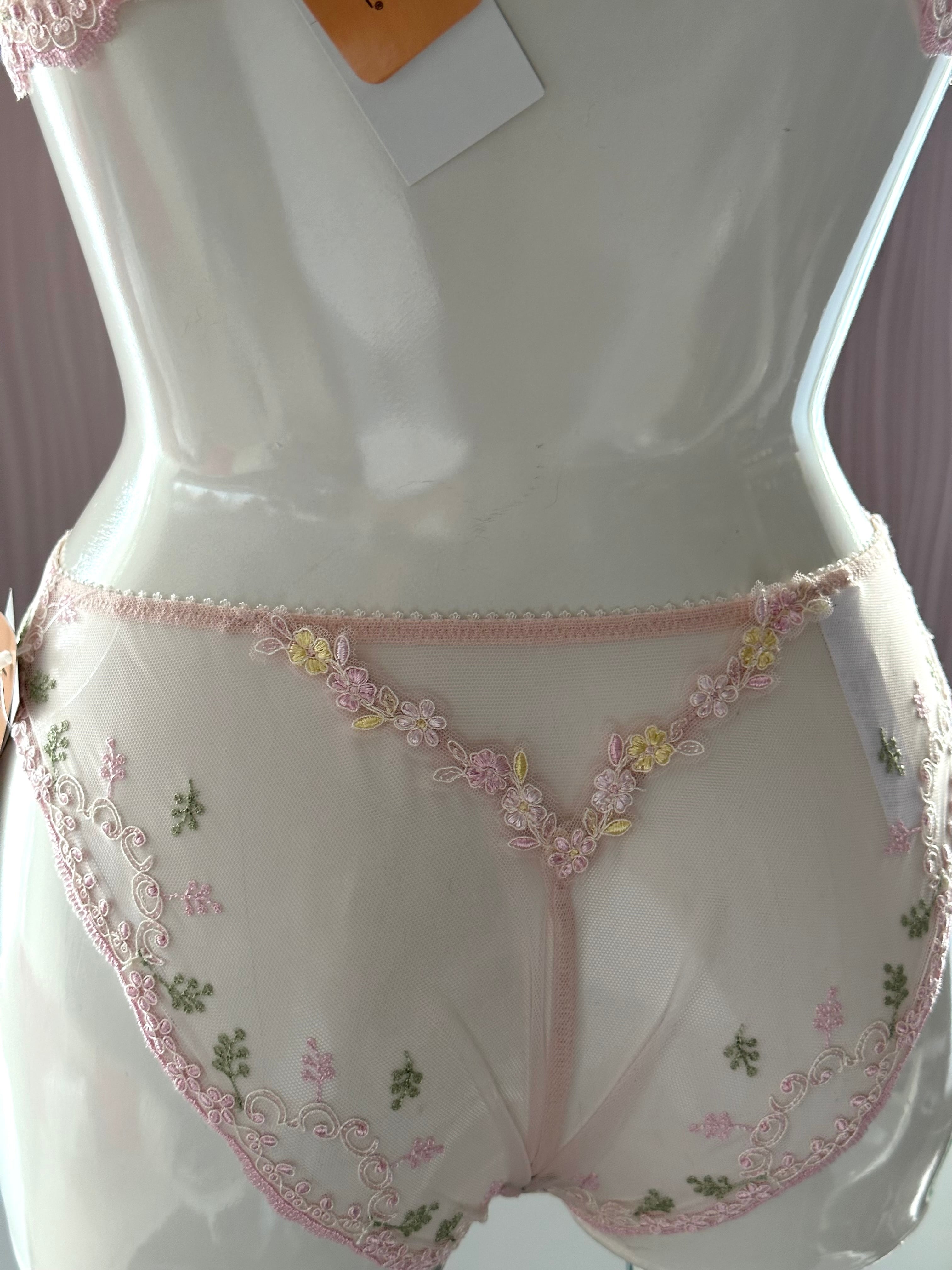 繊細なチュールに施された花の刺繍が、パステル調の色調を引き立て、