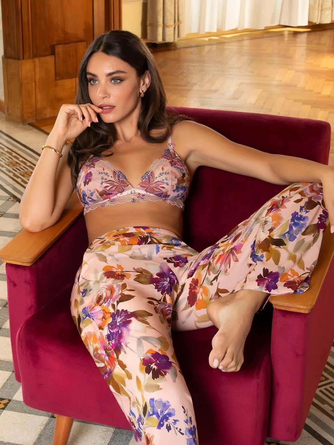 7色の糸からなる花の刺繍は軽やかなルレックス糸の貴重な反射によって