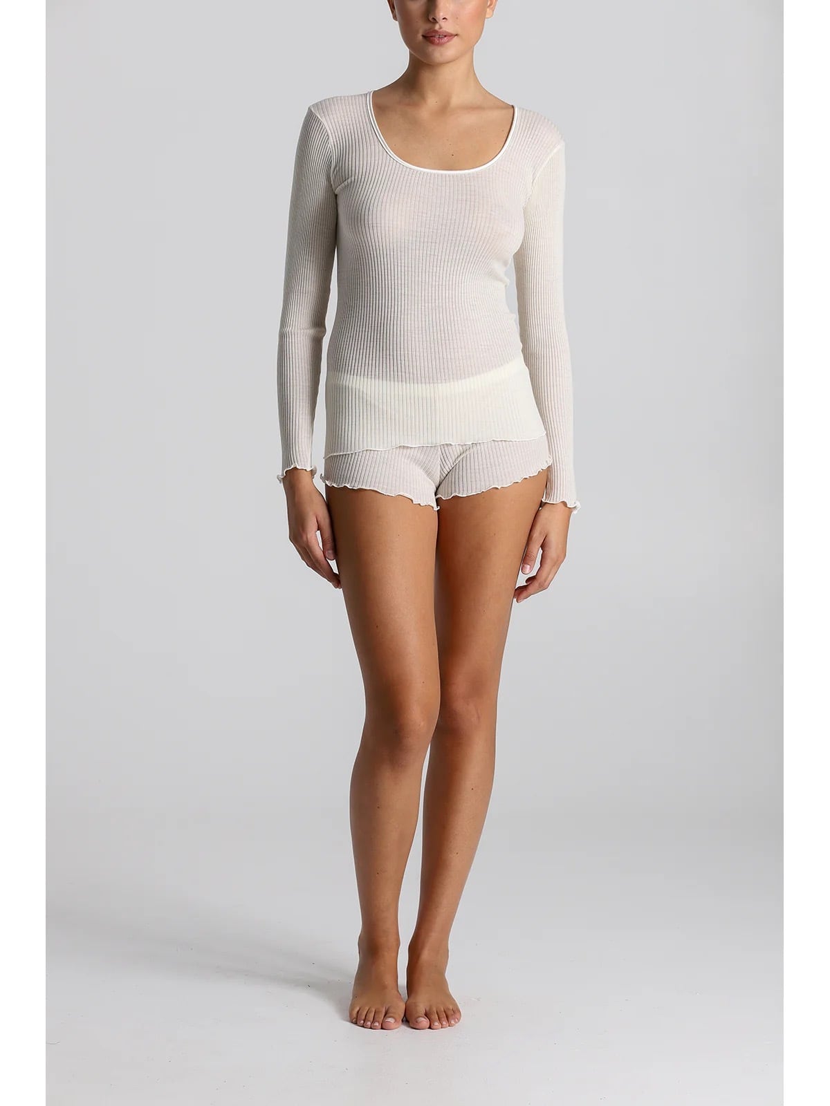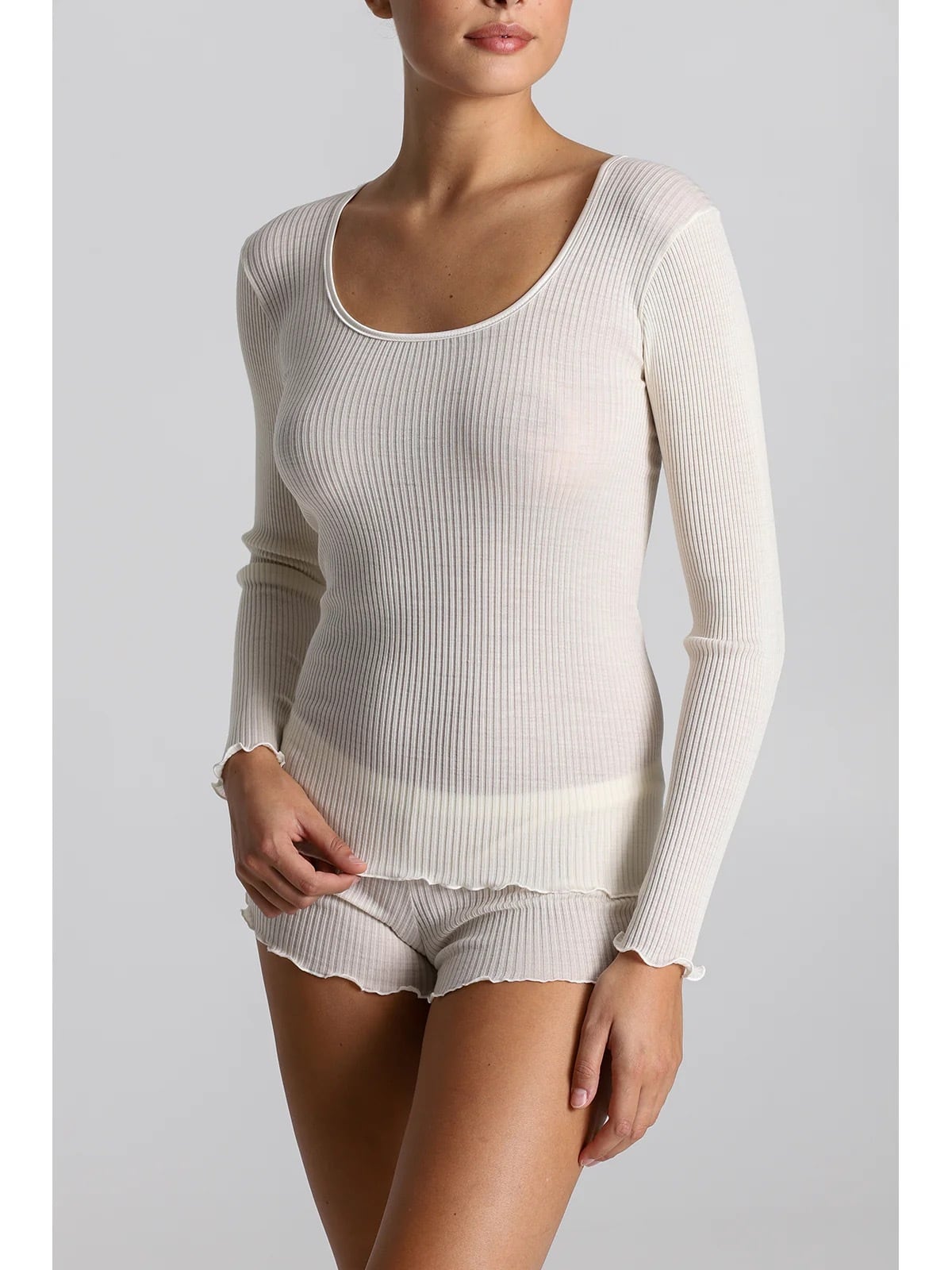 ウールとシルクの柔らかなリブ編み、ロングスリーブで広めのネックライン。