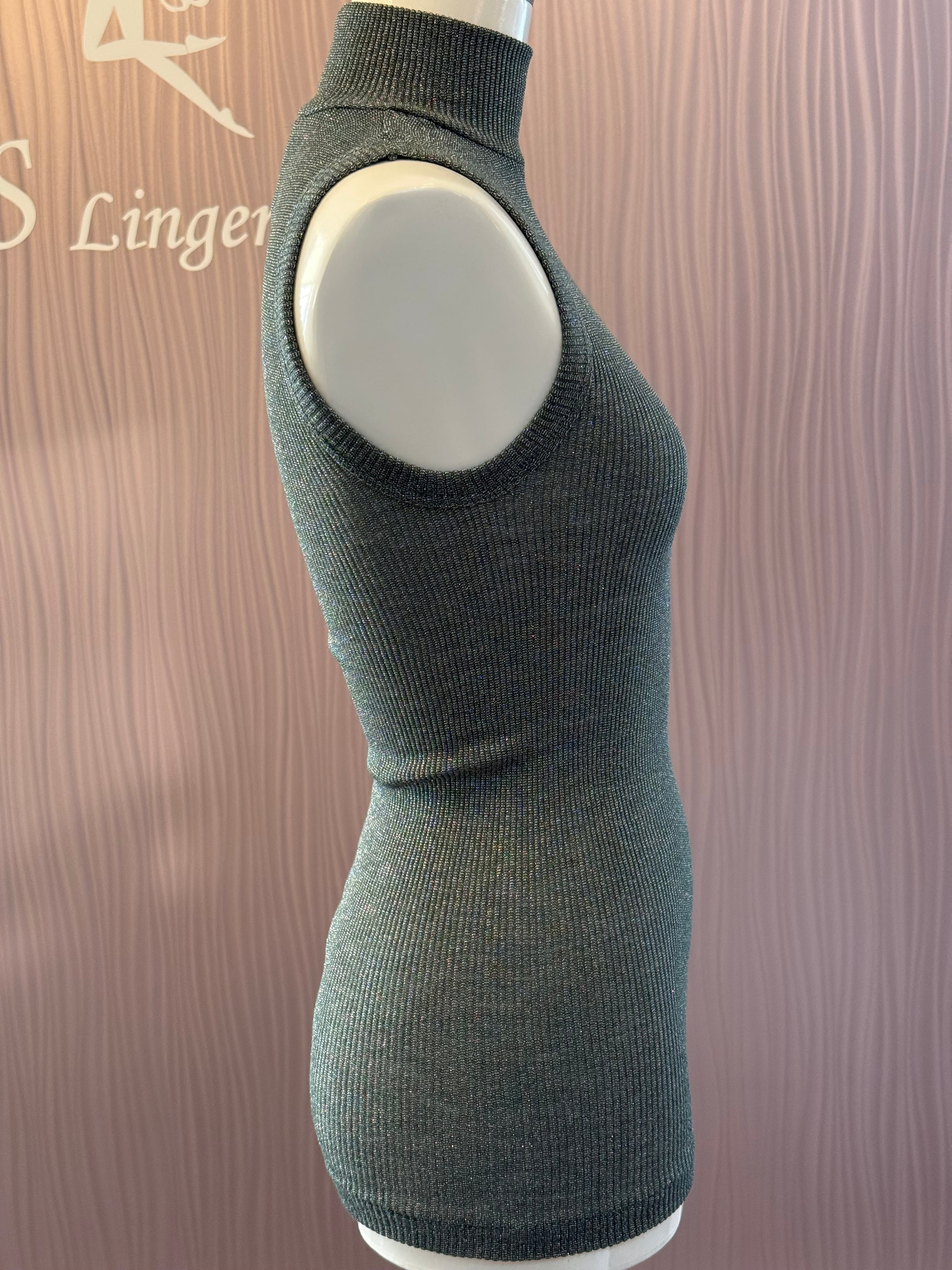 光沢のあるウール・シルクのノースリーブのタートルネック、ラメのディテール付き。