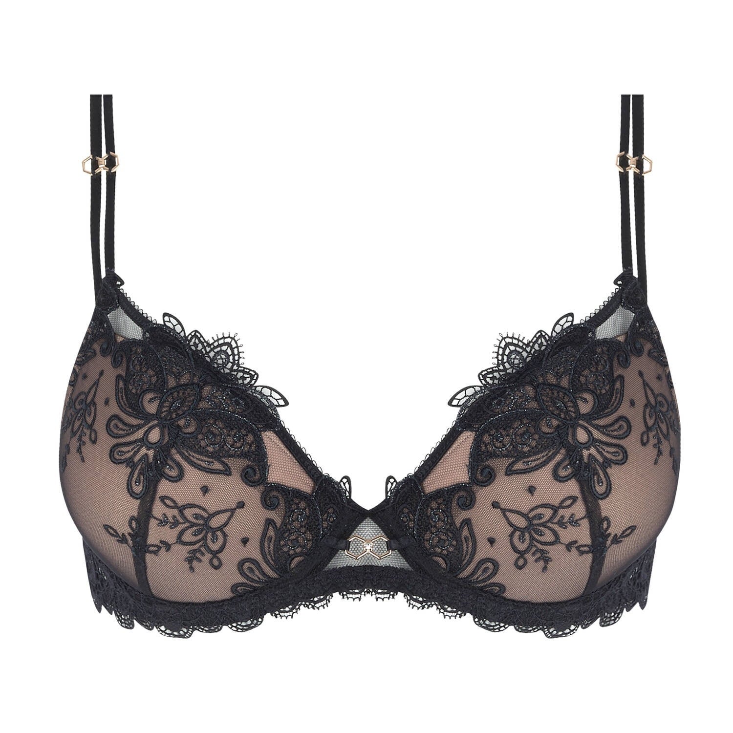 ダーツ入りのカップは、クリスタルチュールに施されたスカラップ刺繍で仕立てられています。ブラの支え部分は刺繍と調和したスカラップレース製で、背面にデザインに構造を与えるリボンディテールが施されています。センターフロントはクリスタルチュール製で、裾にはスカラップレースのトリムを施し、サテン仕上げの伸縮リボンで固定されたラインストーンジュエリーをあしらっています。調節可能なストラップにはジュエリーディテールを配し、洗練された優雅な仕上げを添えています。