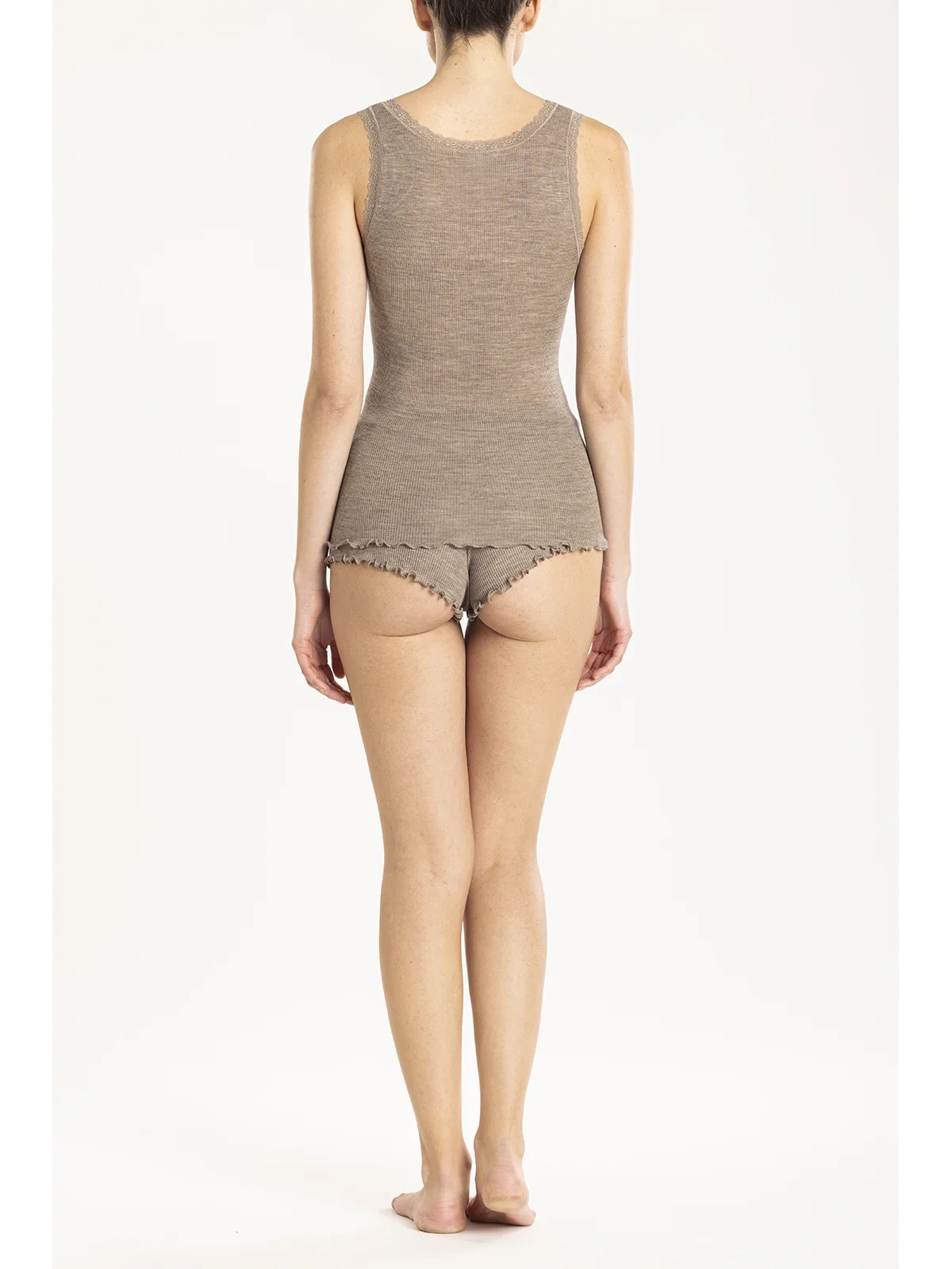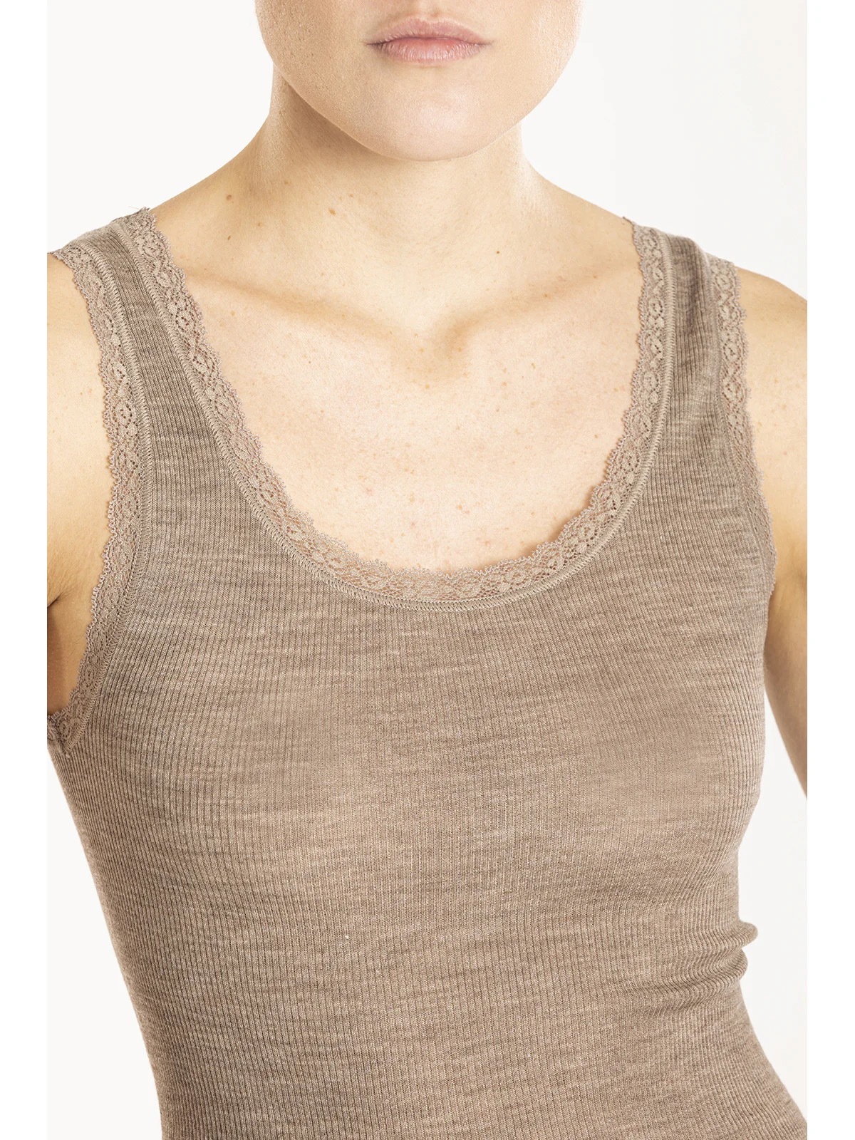 高級で柔らかなウールとシルクを使用したレディースキャミソール。幅広のストラップとUネックラインにレースのディテールを施しています。洗練された着心地、耐久性、比類のない快適さを実現。極薄のシルクが軽やかさを、ウールが温かさを与えます。