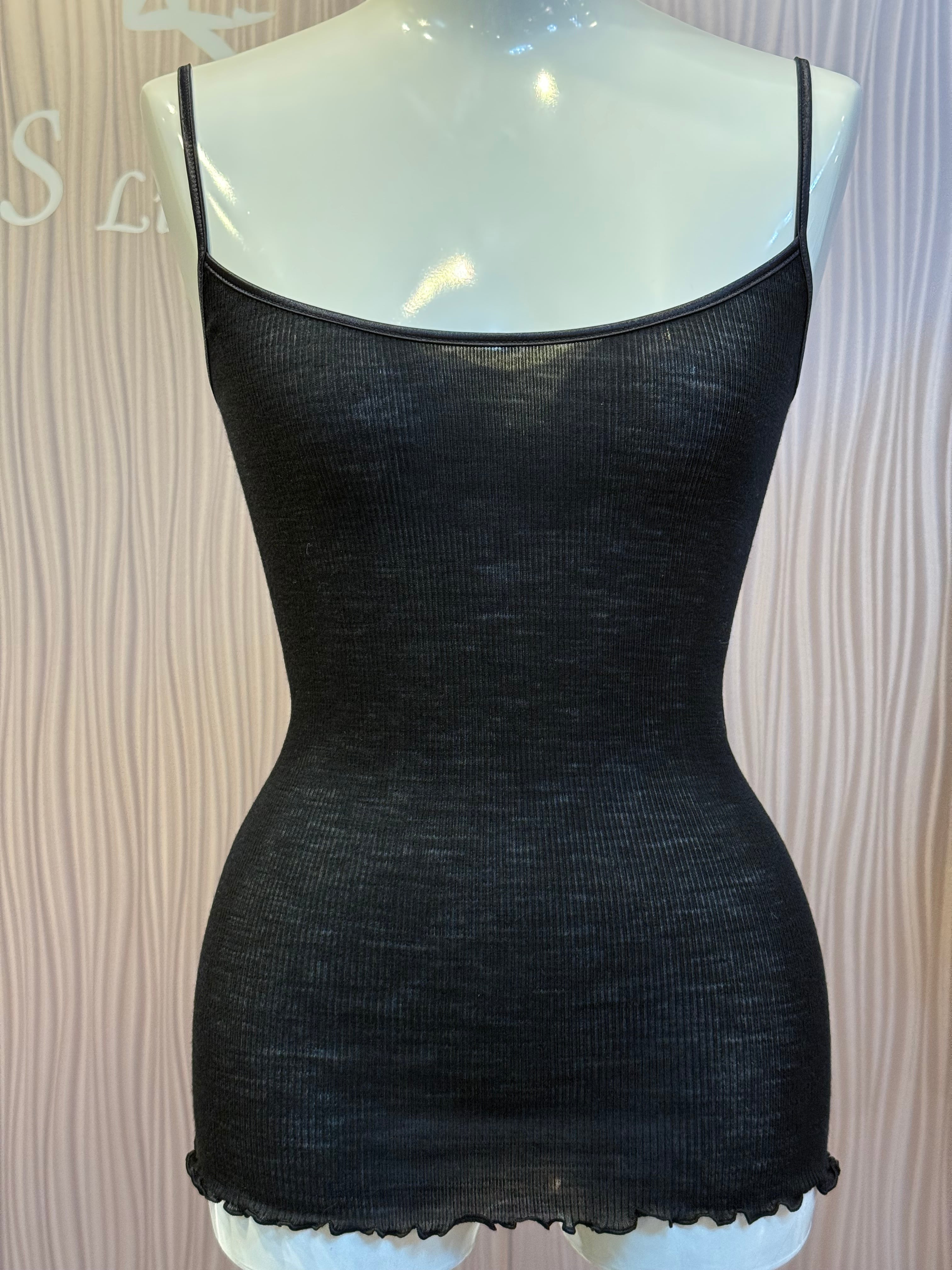 ウールとシルクのリブ編みで、体にフィットする柔らかな肌触りの女性用タンクトップ。