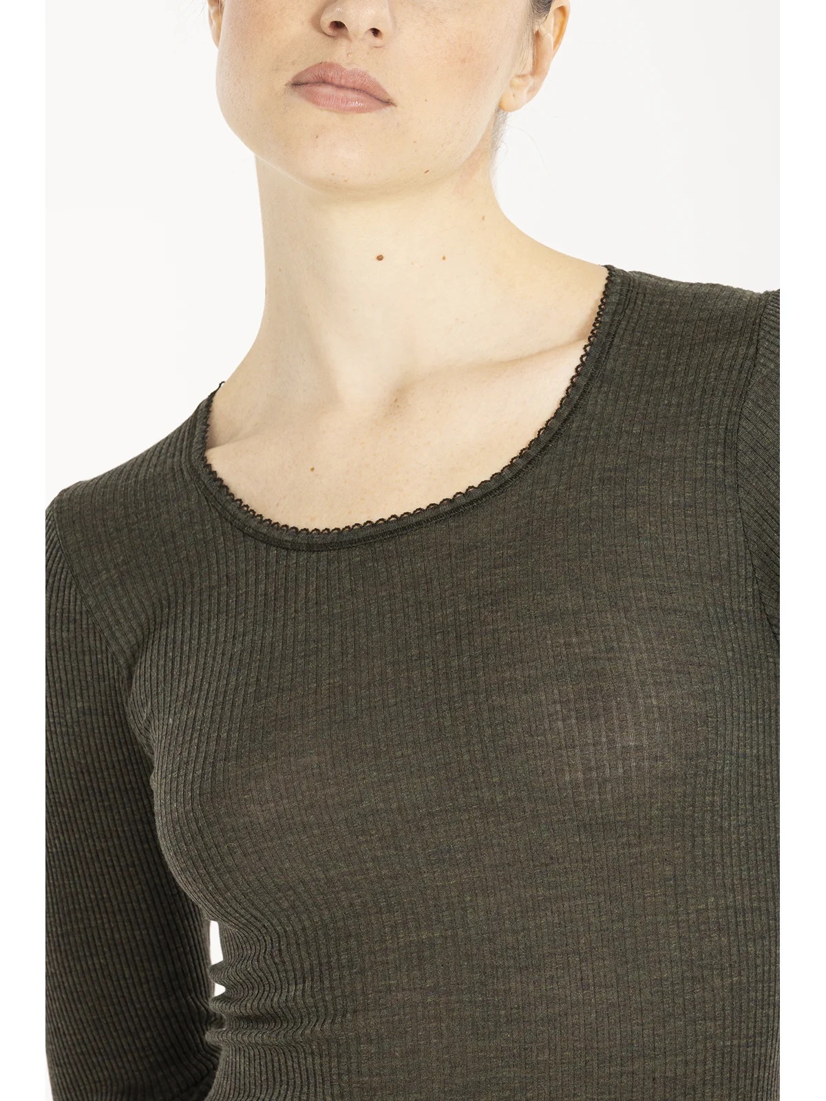5x4の細かなリブ編みで、ウールとシルクの混紡素材が肌になじみ、暖かく快適です。長袖、ラウンドネック、フリルヘム、シームレス仕様。肌触りの良さを追求したデザインです。