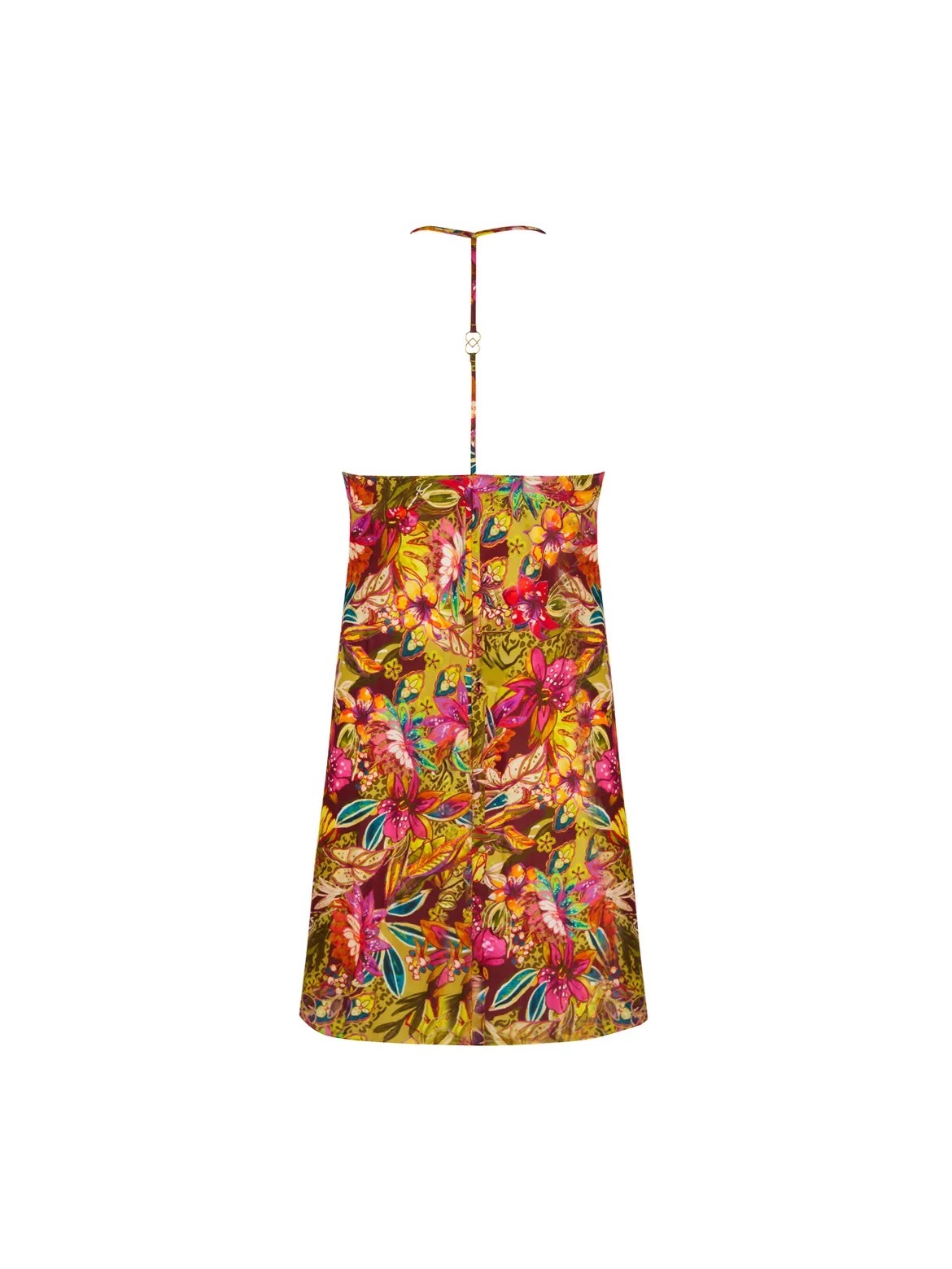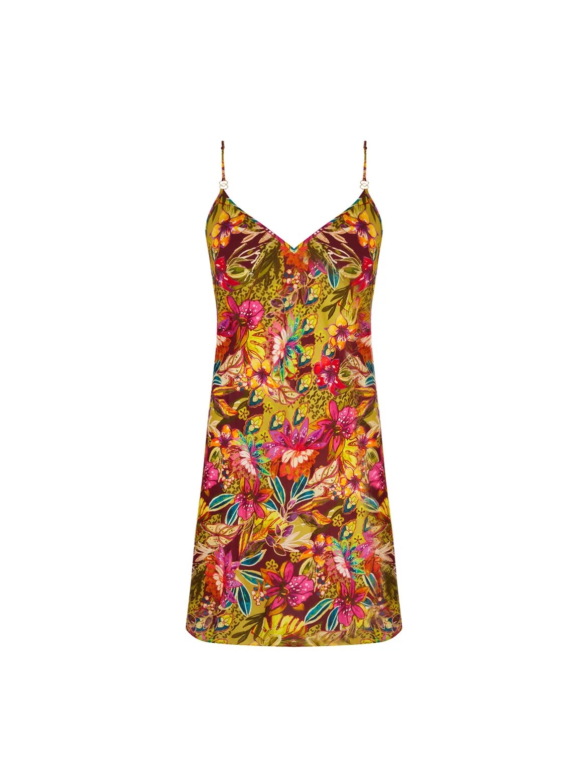 プリント柄のケミーズ。Vネックデザイン。フロントストラップにはゴールド調の宝石がアクセントとして施され、背中の中心で1本の調節可能なストラップに合流。こちらも宝石で飾られ、エレガントな仕上げとなっている。