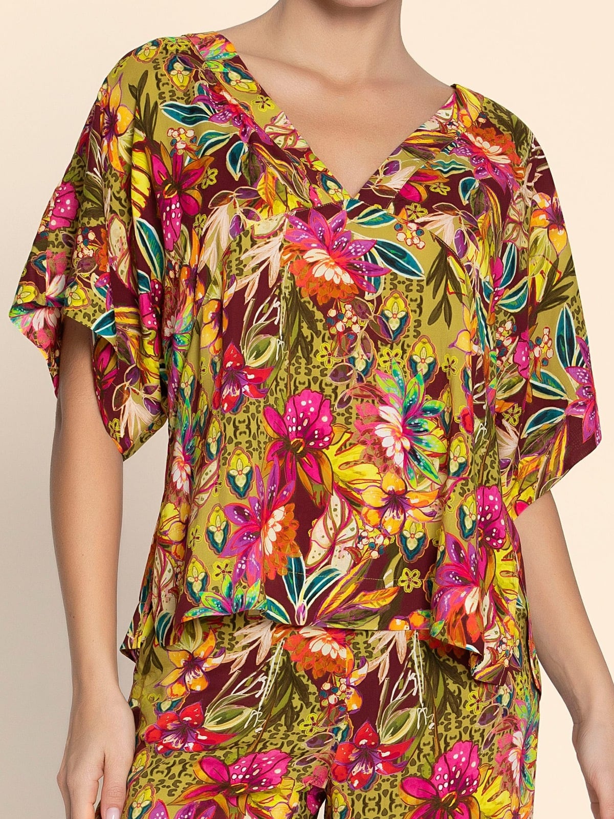 ゆったりとしたシルエットの半袖チュニック。アンダーバストにインセットを施し、Vネックラインとサイドスリットで動きやすさと流れるようなシルエットを実現。