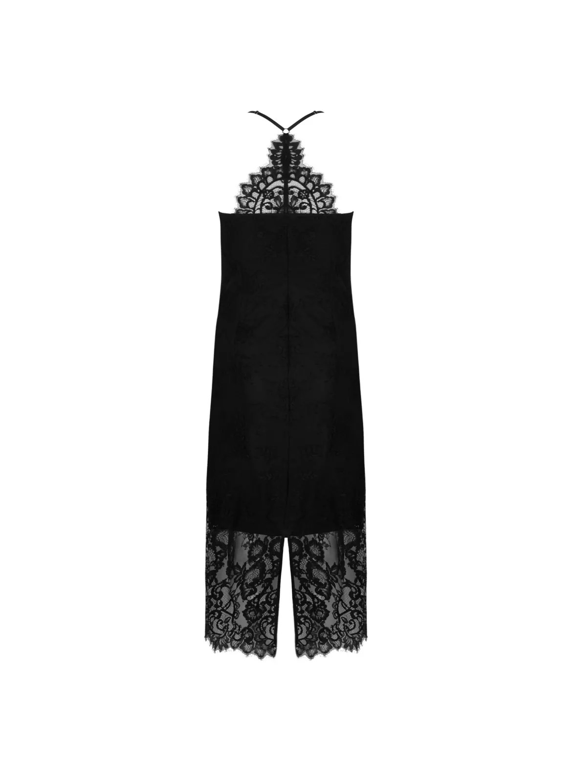 セクシーなホルターネックのナイトガウン。胸元のスリットと袖口のスカラップエッジが特徴。背中の上部にはスカラップレースの三角形があしらわれています。アンダーバストはゴムバンドでサポートされ、ボディ部分は裾にスカラップレースが施されています。首元には調節可能なストラップ付き。