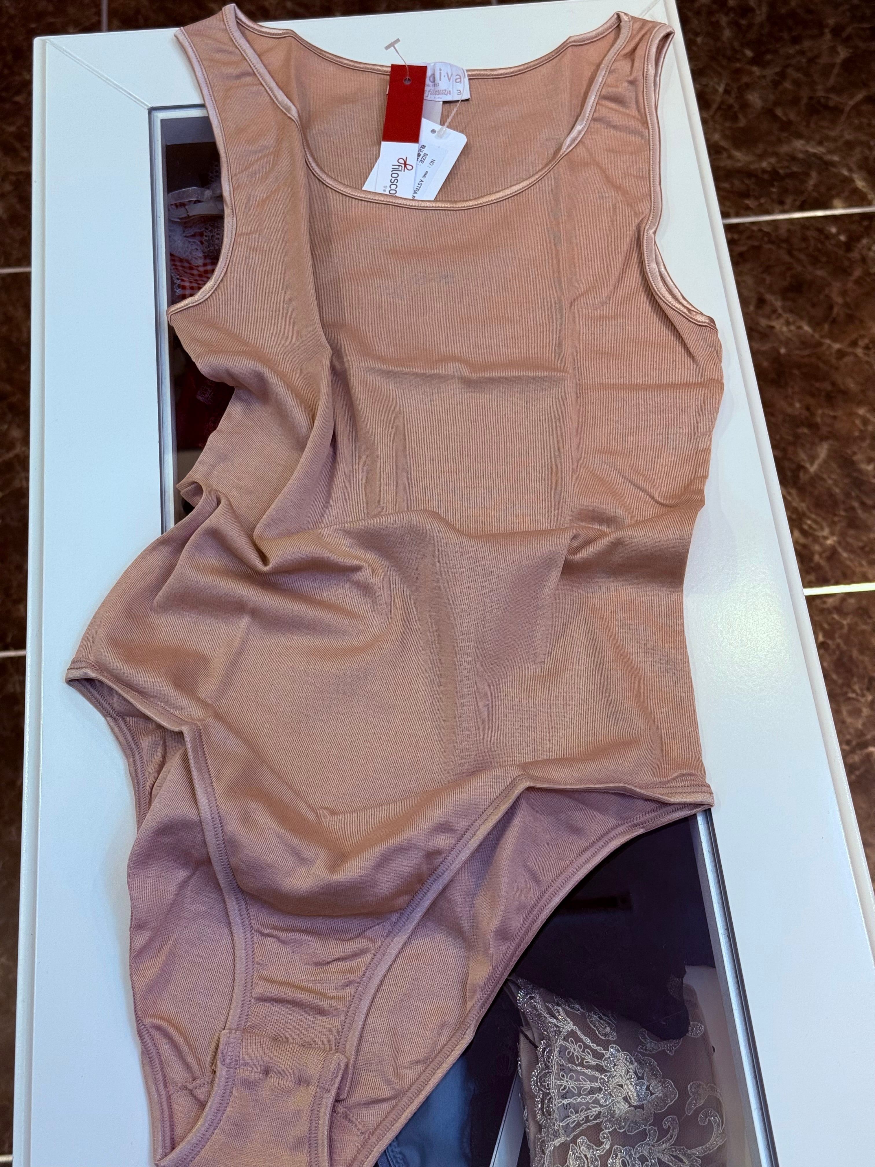 Filoscozia®認定のコットンを使用した、肩幅の広いレディースボディスーツ。サテンの縁取りがアクセントになっています。