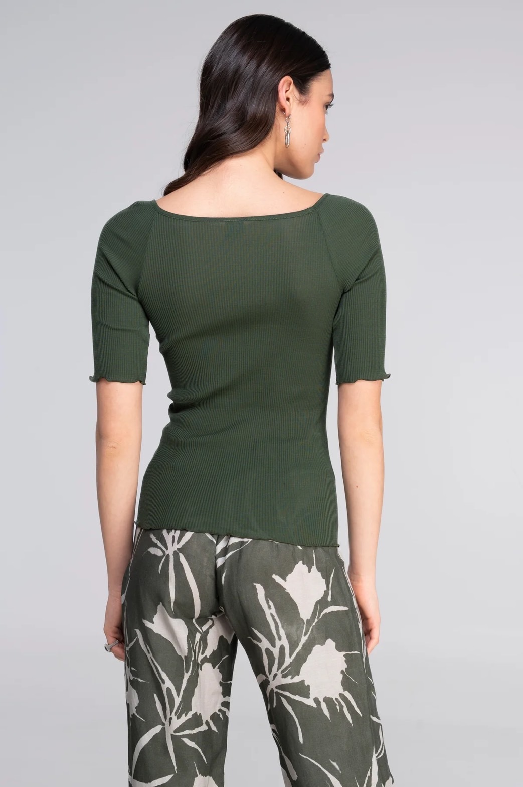 純エジプト産マコーマーセライズドコットン(フィロスコジア®)を使用した繊細なリブニット生地のTシャツ。スクープネックラインと肘まで届くショートスリーブが特徴です。サイドシームレス構造で肌に触れる感触が極めて柔らかく、体に最も快適なフィット感を実現。日常使いに最適なトップスです。