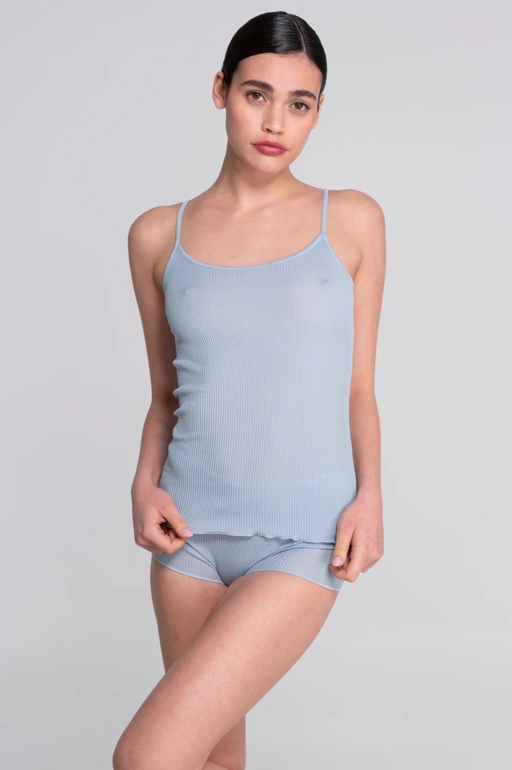 ピュア・エジプシャン・マコ・マーセライズド・コットン(Filoscozia®)の繊細なリブニット素材を使用したスパゲッティストラップキャミソール