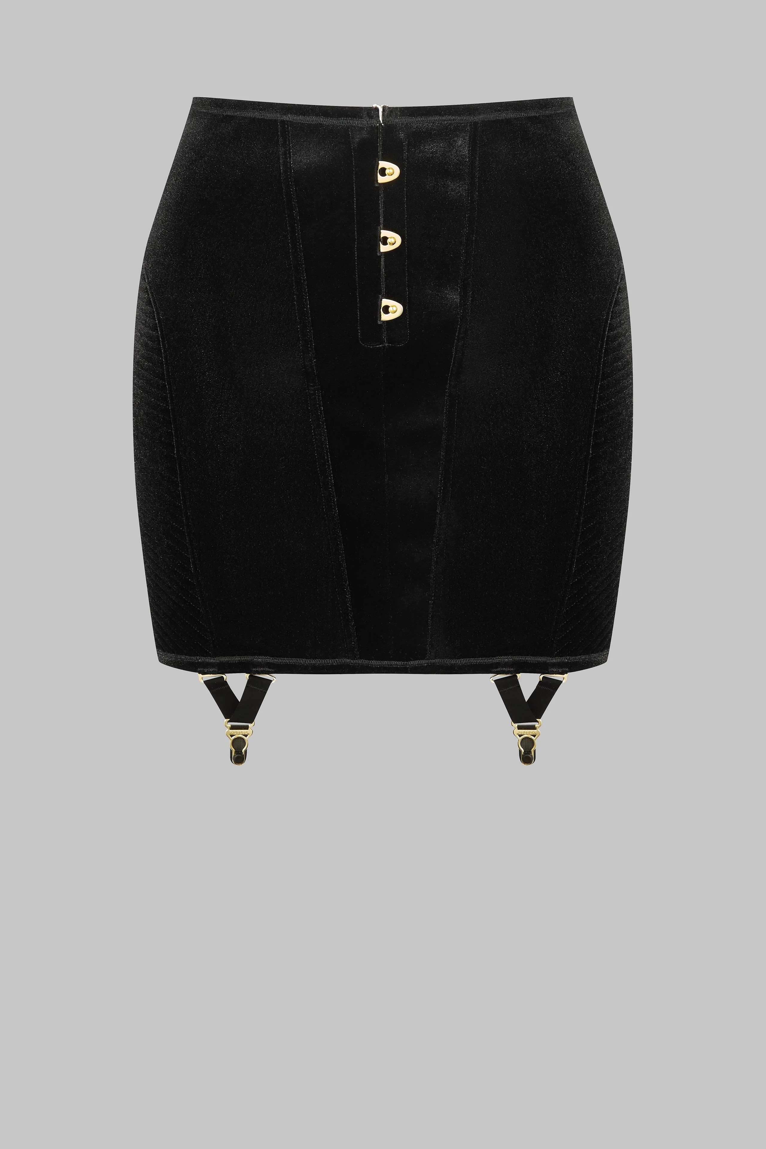 ロココ調ガータースカートは、ベルベット素材で仕立てられたコルセット着想のアイテム。