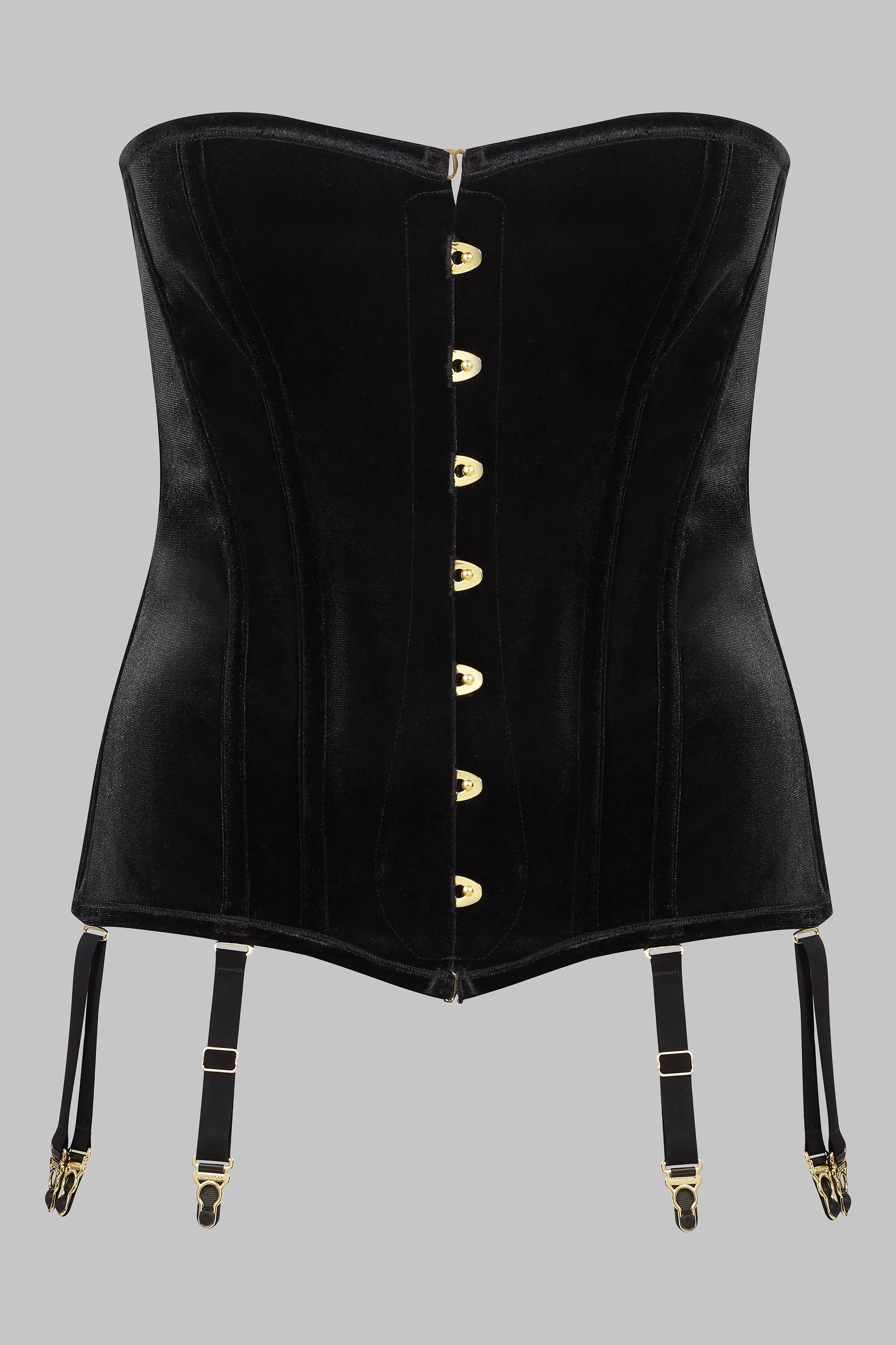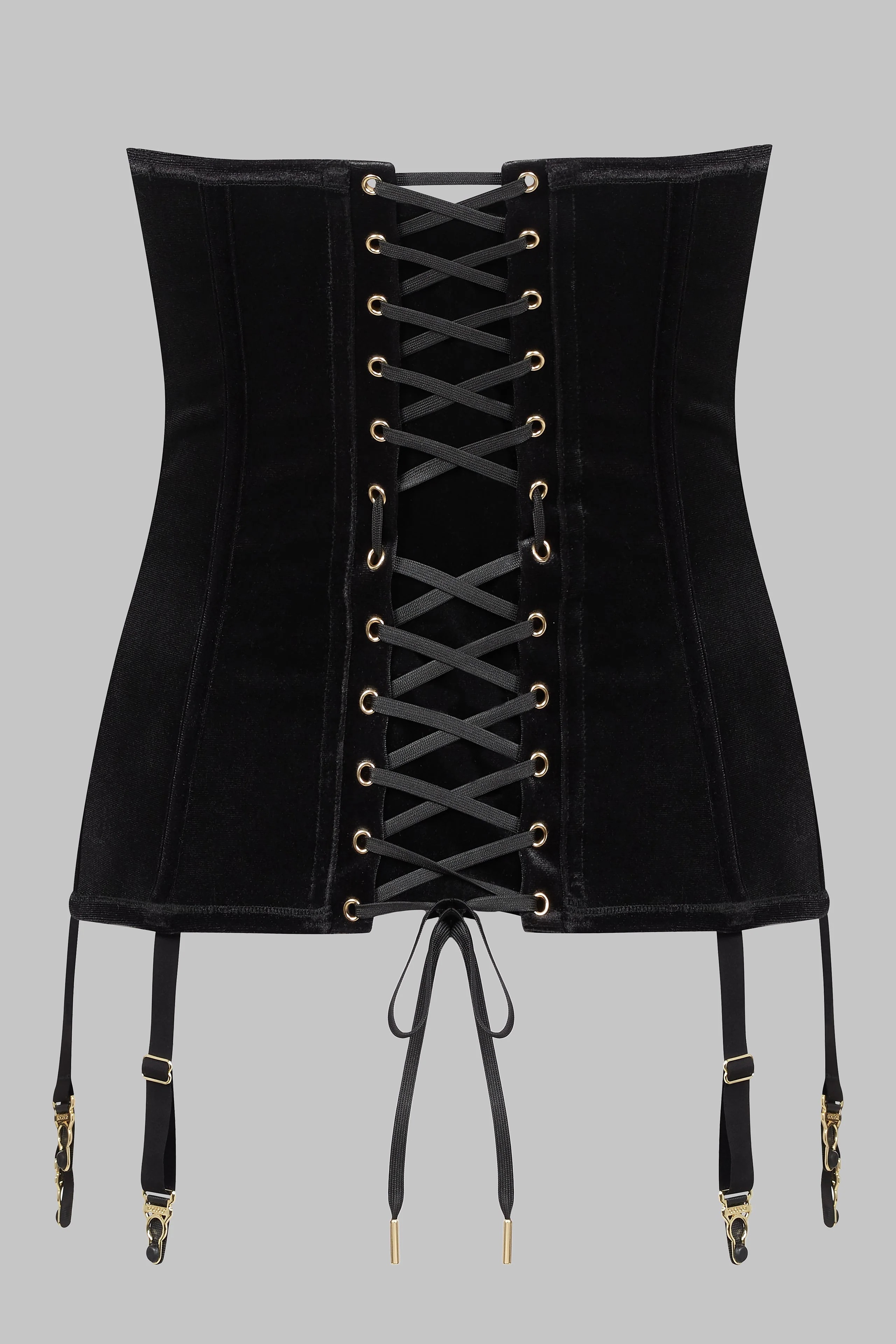 ロココ調ガーターコルセット(ベルベット製)。伝統的なコルセット技法に着想を得て、ウエストを彫刻のように整えシルエットを際立たせるデザイン。柔軟なスチールボーンとしっかりした内張りにより、構造的なフィット感を実現。コントロールされたプッシュアップ効果をもたらしつつ、快適な着用感を確保。