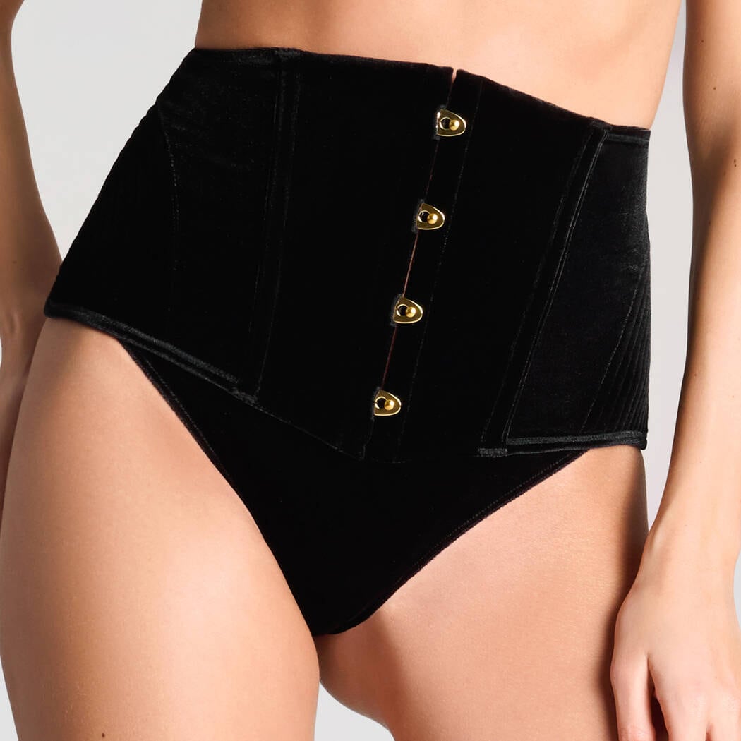 ロココ調のウエストシェイパー。伝統的なコルセットに着想を得たフルベルベット仕様で、ウエストを包み込みシルエットを美しく整えます。柔軟なスチールボーンが締め付け感とシェイプ効果を生み出しつつ、快適な着用感を実現。