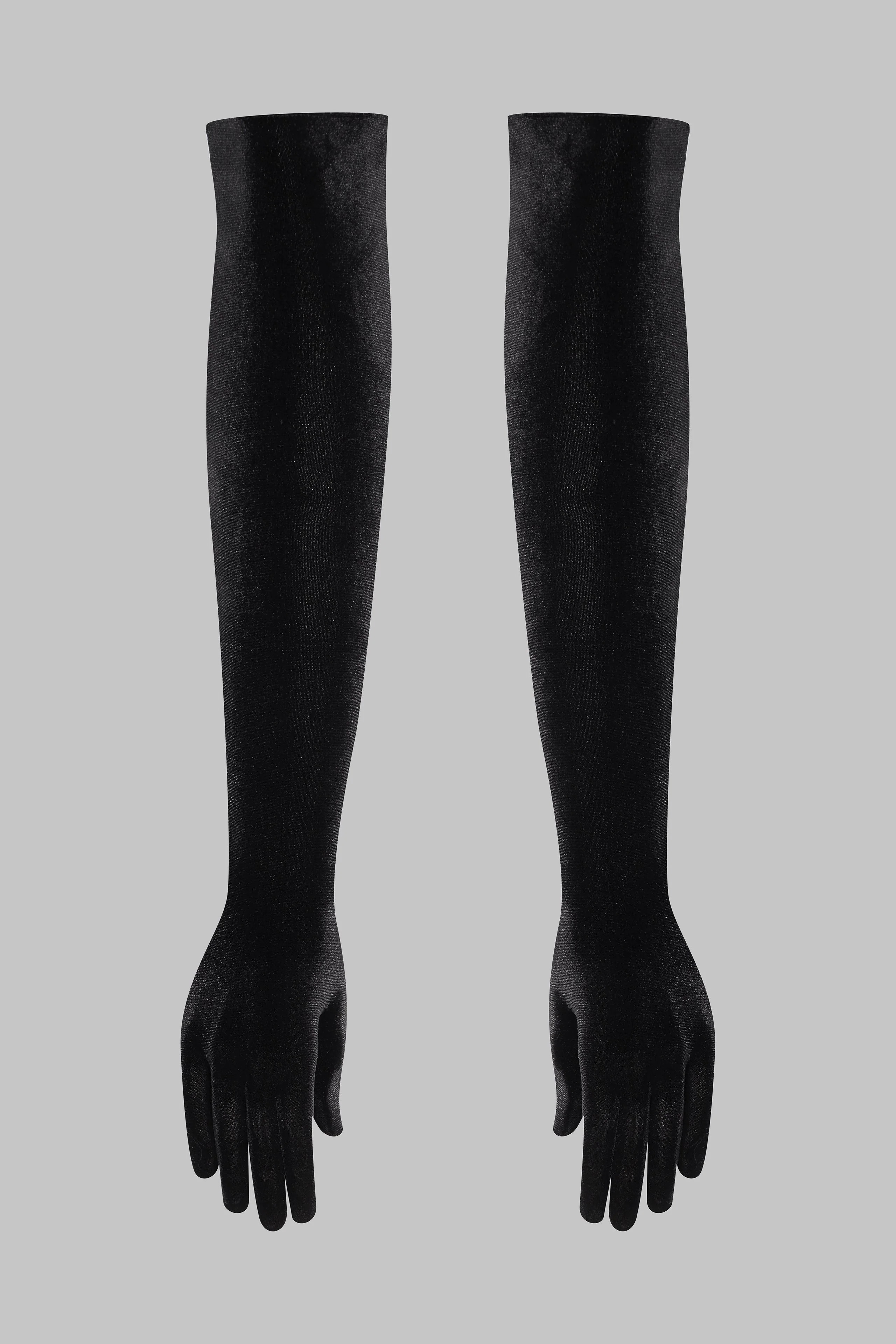 ロココ風オペラグローブは、腕のラインを美しく引き立てる舞台用アクセサリーとしてデザインされたフルベルベット製。柔らかな生地が肌を優しく包み込み、流れるような動きでドラマティックなオートクチュールの魅力を放つ。