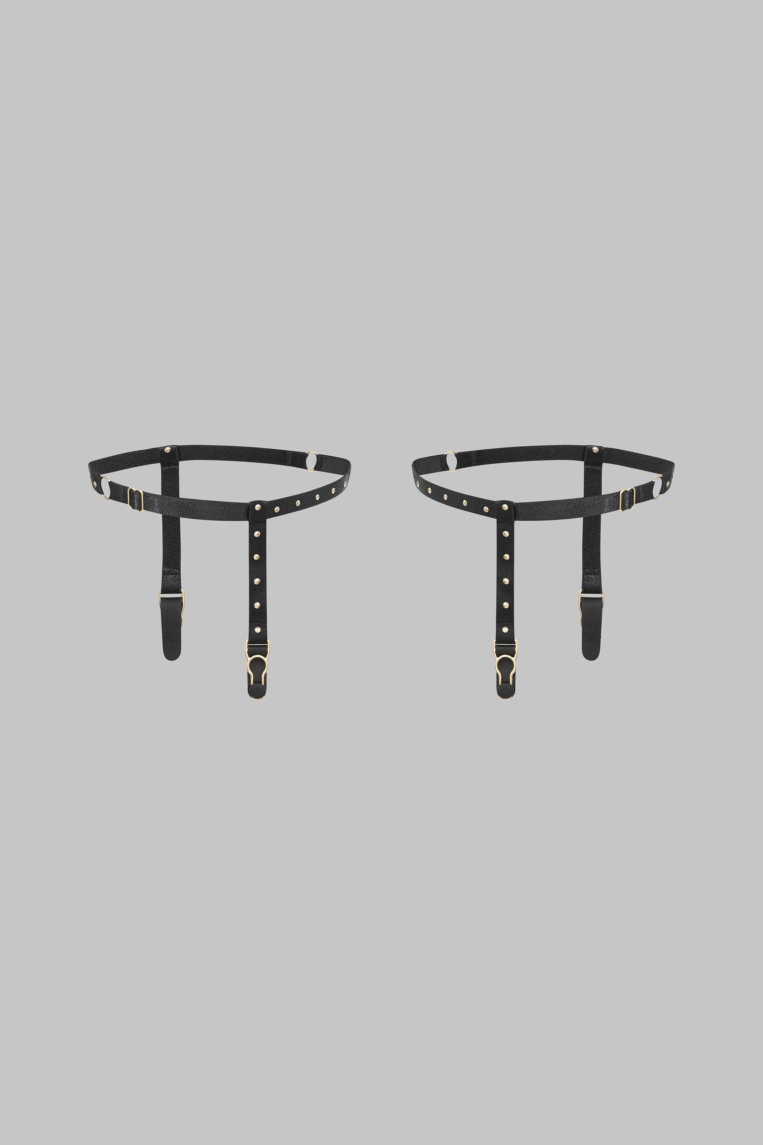 パリュール・クルーのブラックガーターは、脚のラインを優雅に描きます。ゴールドのスタッズで装飾され、あらゆる体型にフィットする完全調節可能なゴムバンドを採用。ゴールドのガーターストラップがストッキングとの優雅な組み合わせを可能にします。単体で着用するもよし、マッチングのパンティーやハーネスとコーディネートするもよし。身体と細部を繋ぐアクセサリーです。