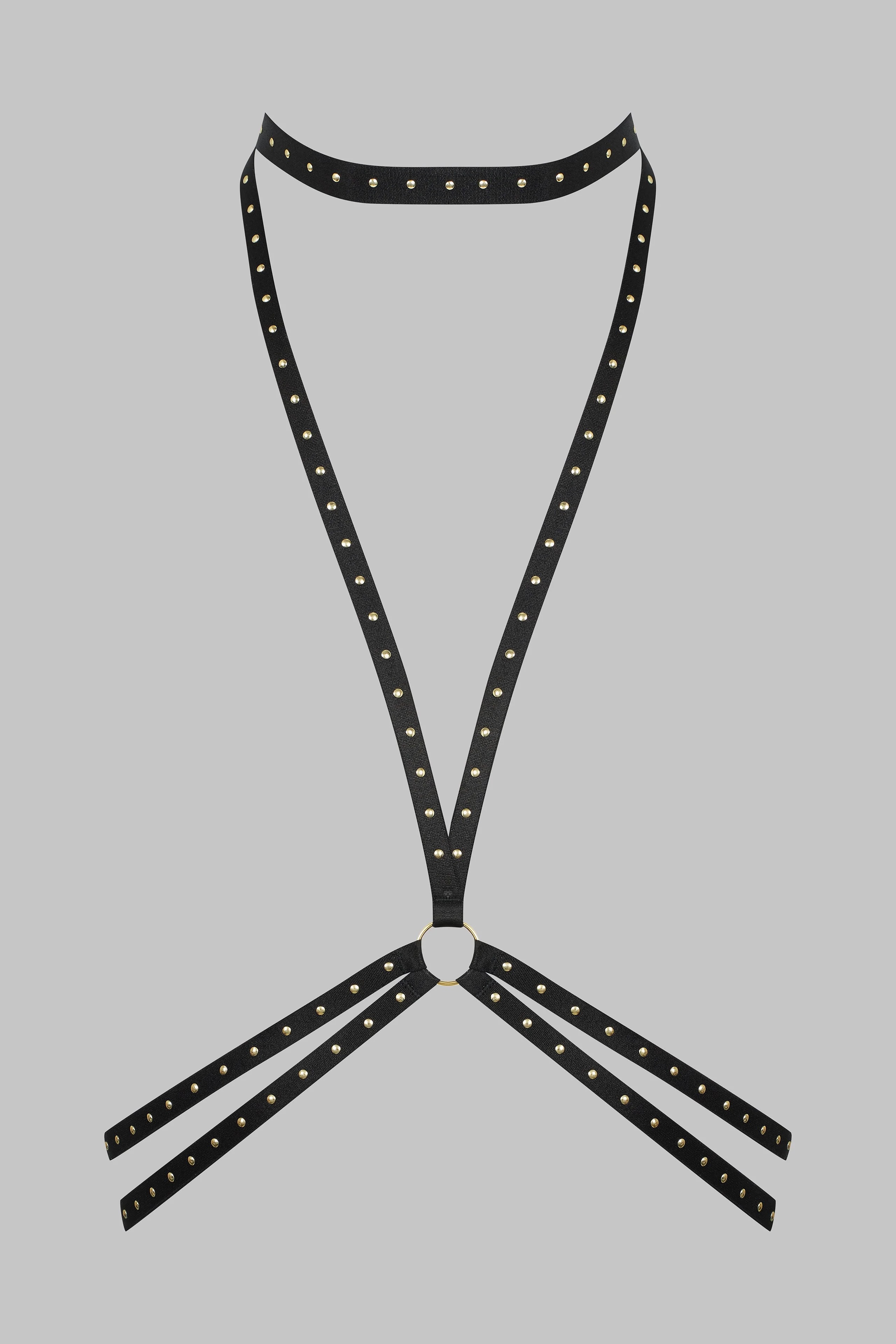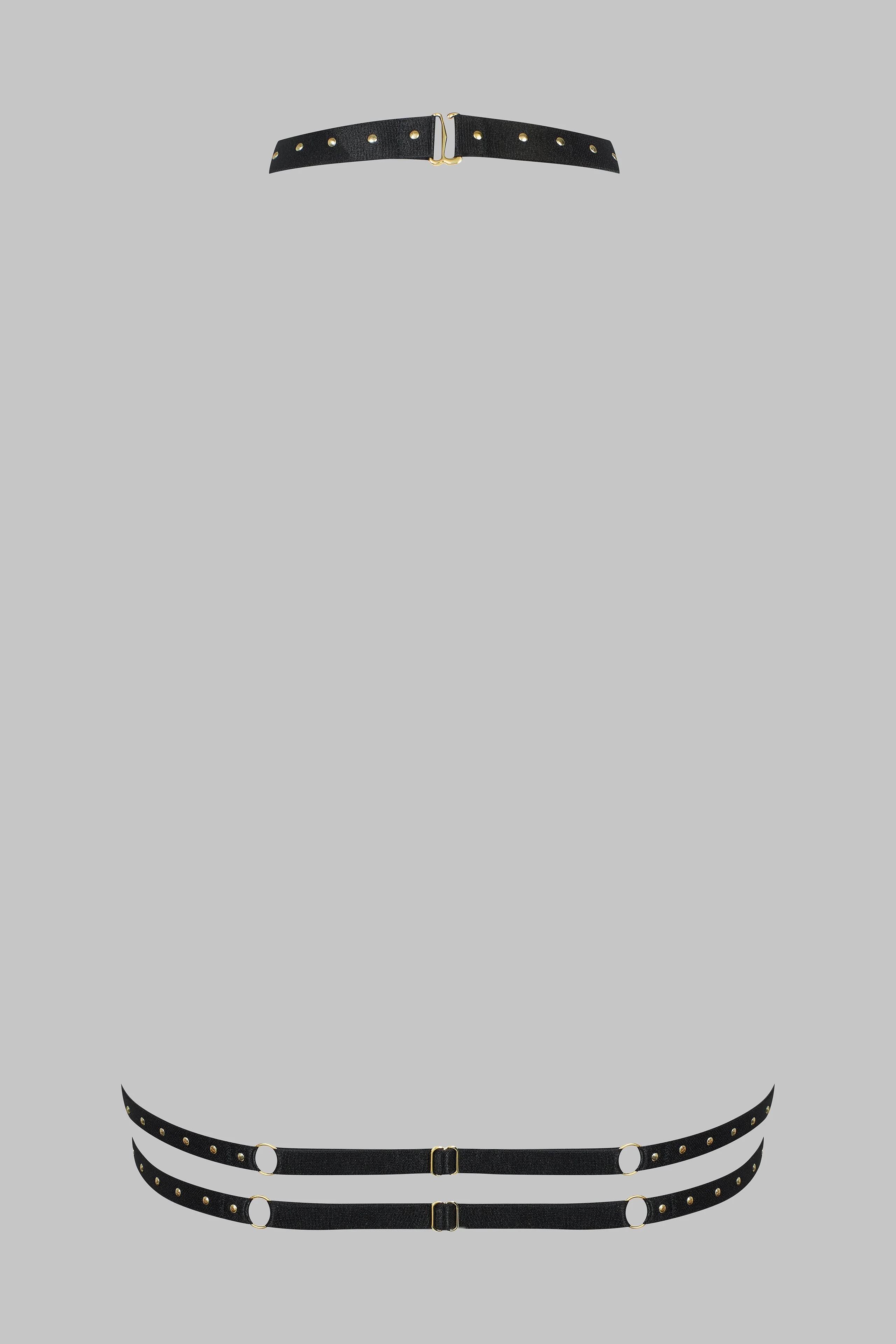 パリュール・クルーのブラックハーネスは、バストラインを精密に形作ります。ゴールドのスタッズで装飾された調整可能な伸縮バンドが、シルエットを優しく包み込みます。単体で着用することも、オープンパンティーやガーターと組み合わせることもでき、幻想的な演出を可能にします。