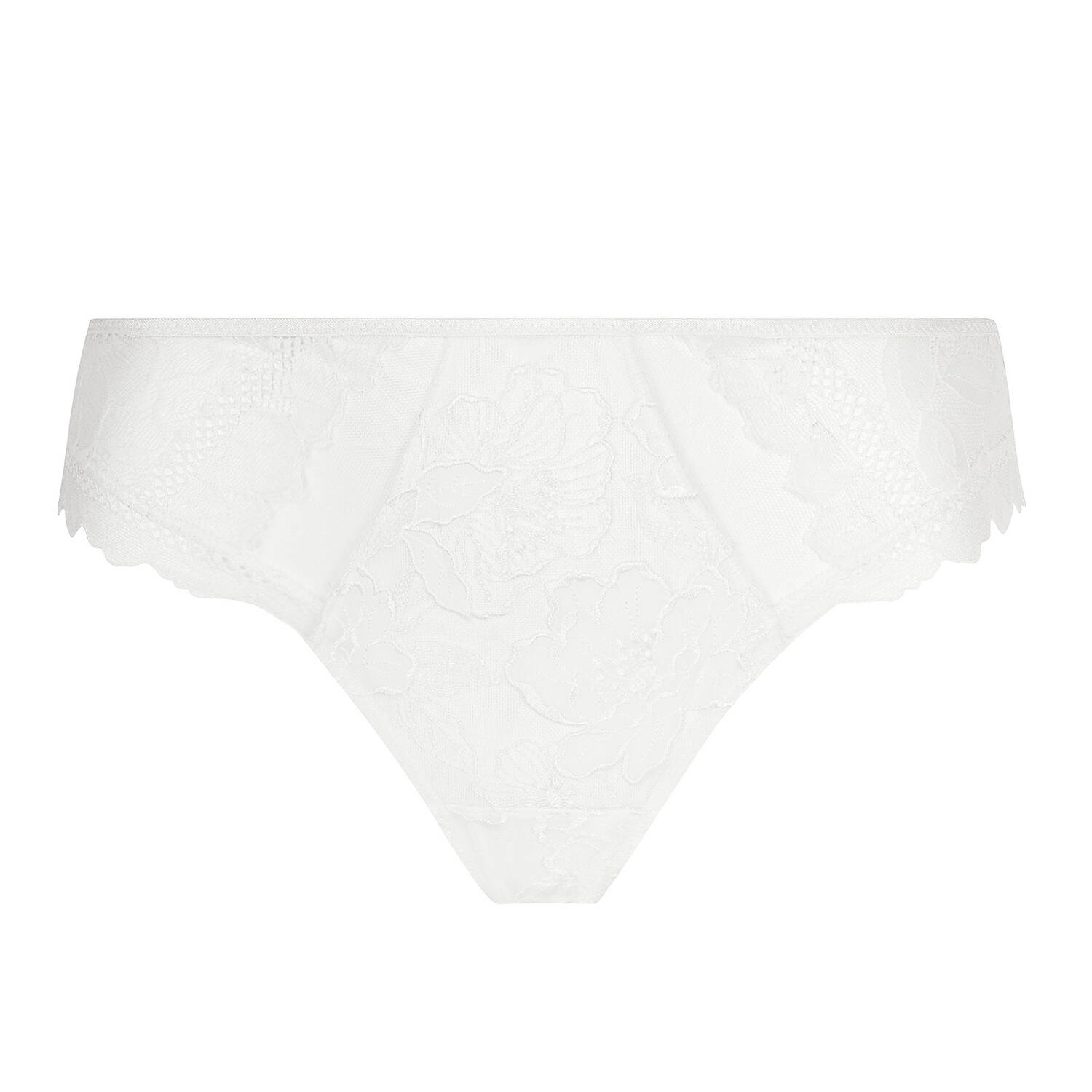 前面にはオーガンザを埋め込んだ刺繍入りラダーインサートをあしらう。前サイドはチュールとジャカードレースで構成され、前面全体はチュール裏地付き。前脚部開口部は繊細な同系色のレーストリムで仕上げ。背面はジャカードレース製で、中央背面に目立たないチュール三角パネルを配置。オーガンザのリボンが仕上げのアクセントとなる。