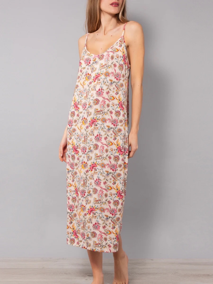 柔らかく軽いビスコース素材にロータスフローラルプリントを施したロングナイトドレス。