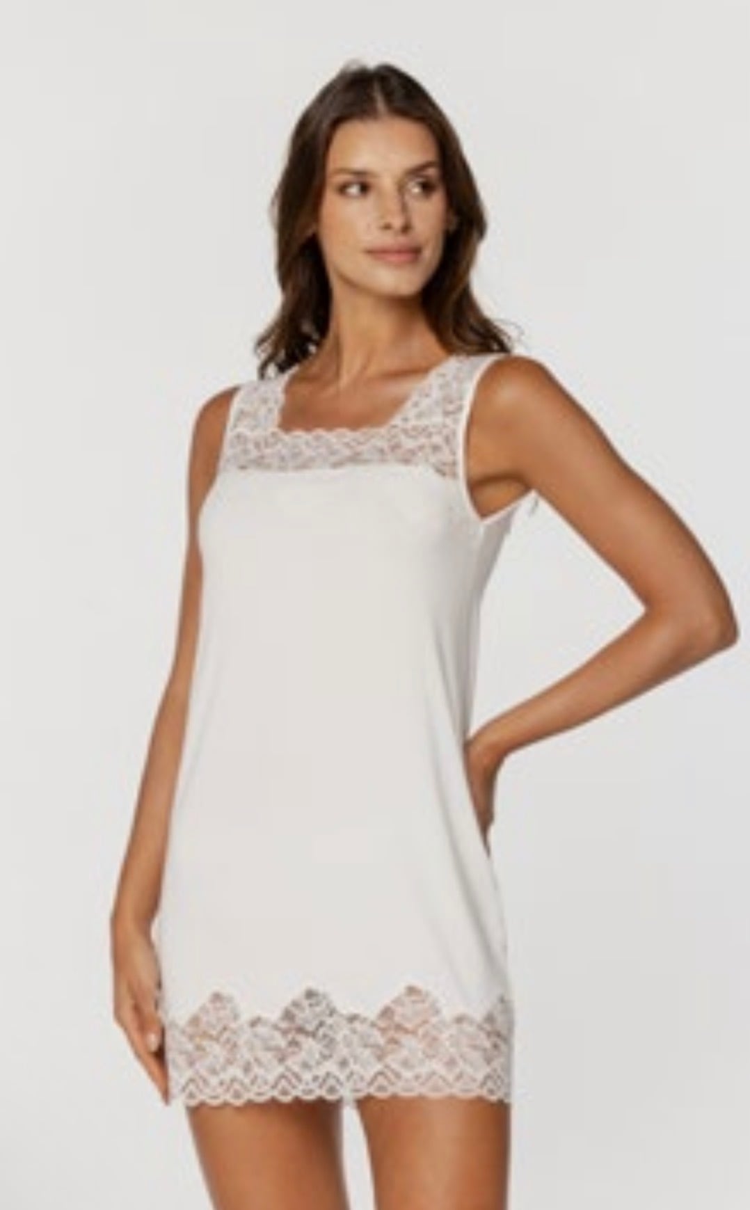 太めのストラップ、スクエアネックライン、裾にレースをあしらっています。