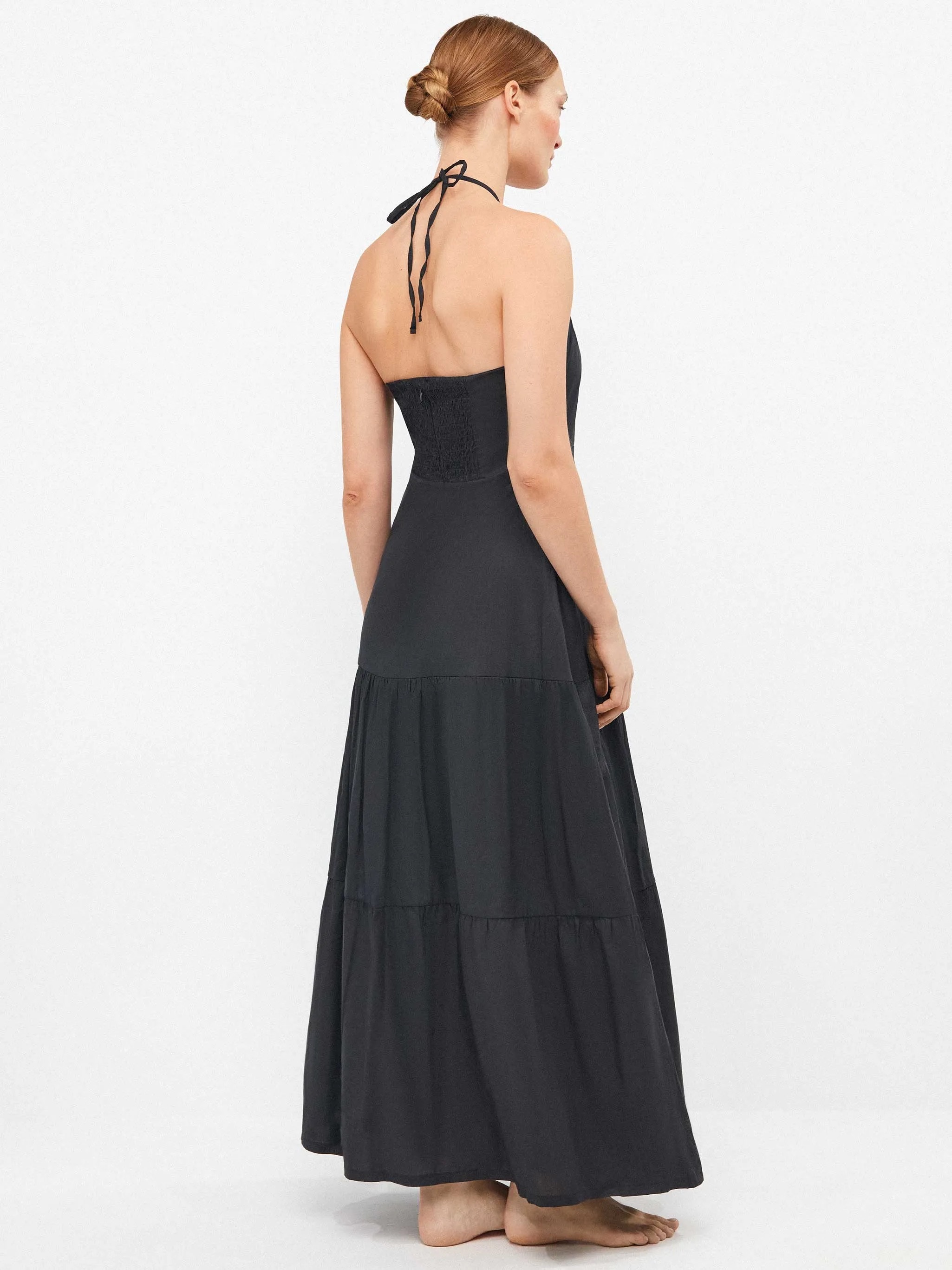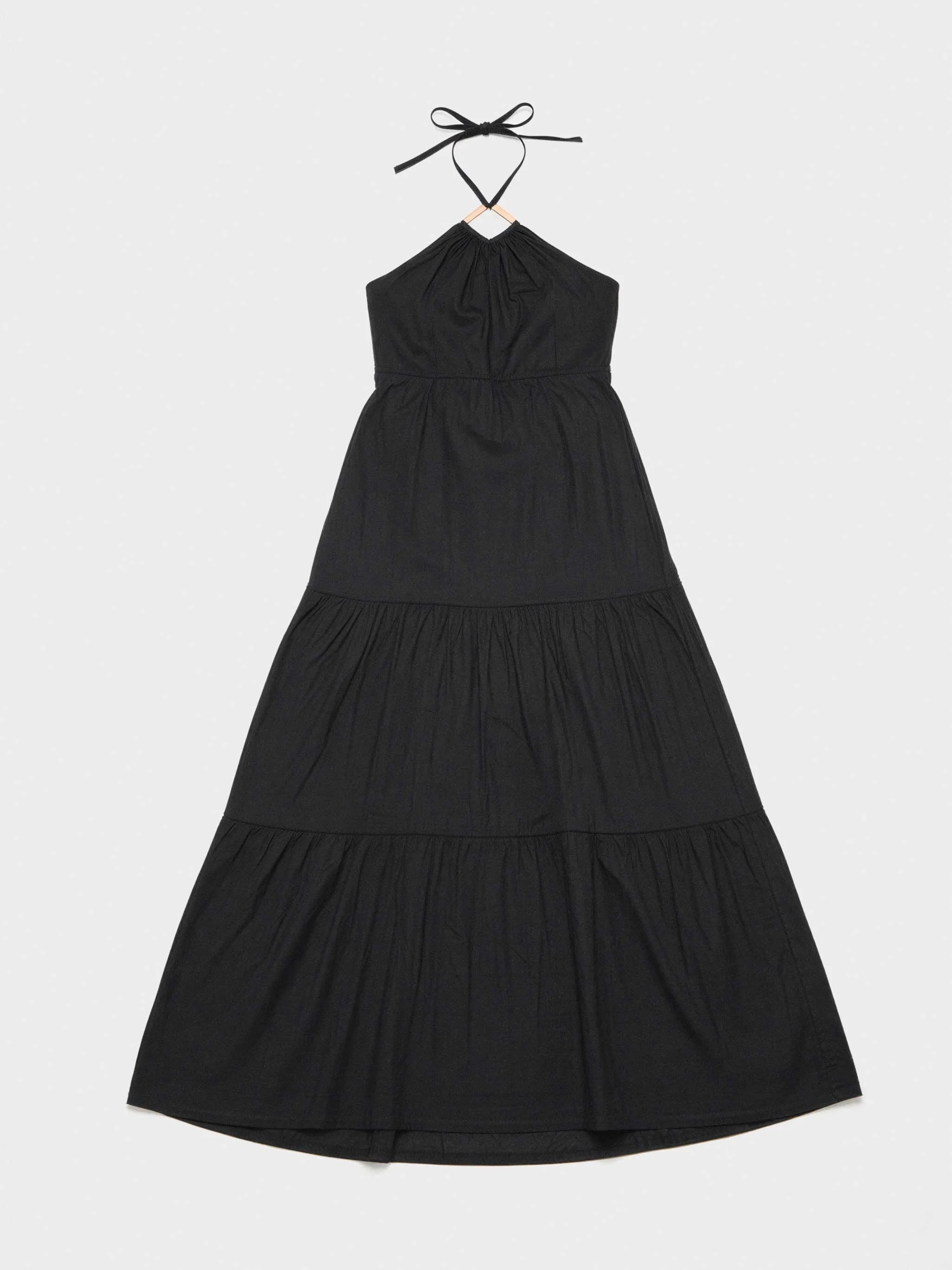 首元で結ぶストラップ付きのホルターネックのロングドレス。
