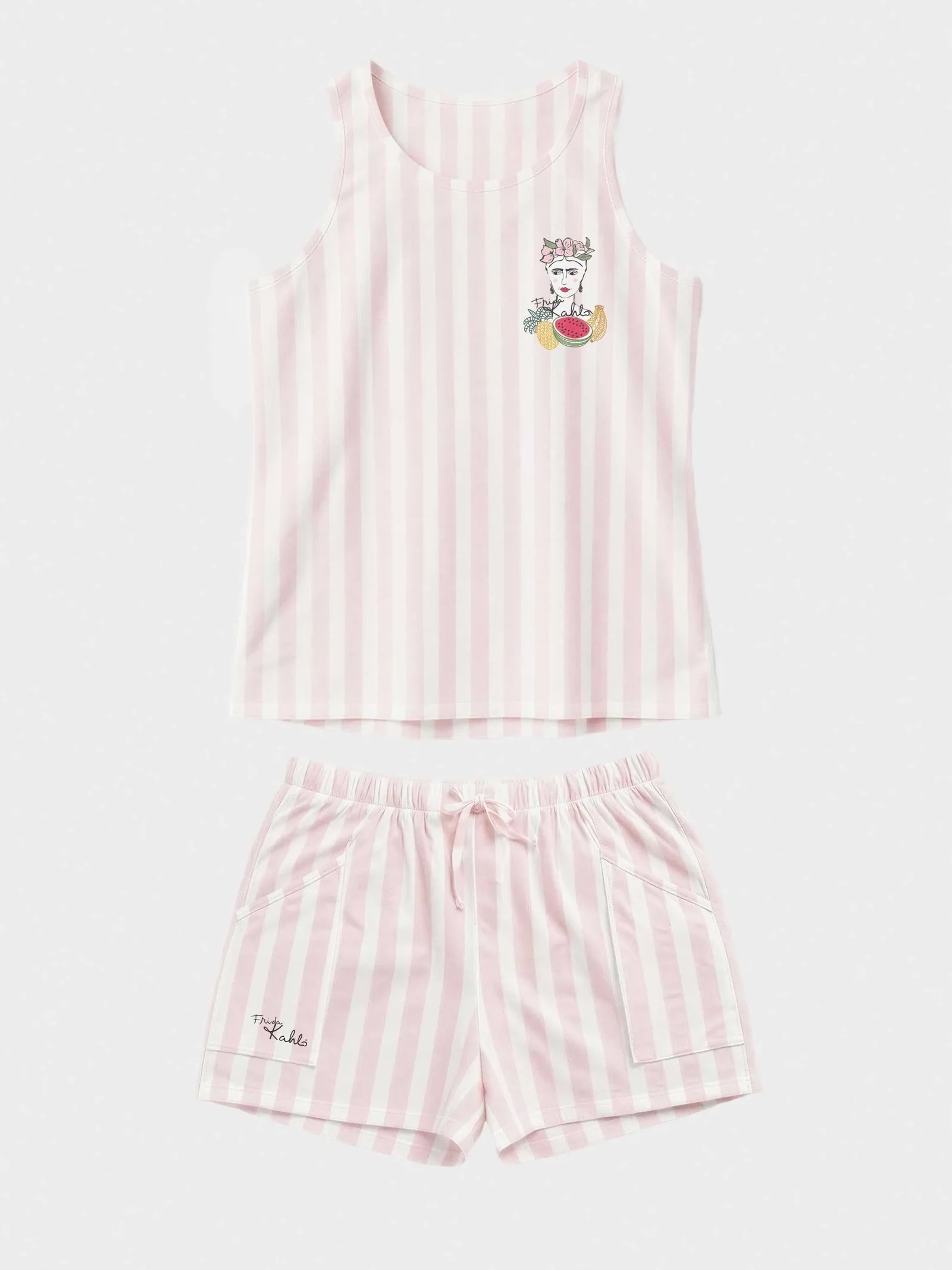 フリーダ・カーロにインスパイアされたパジャマ。素材は綿100%。幅広のストラップと縁取りが特徴のトップスは、ストライプ柄にフリーダ・カーロのイラストが前面にプリントされています。ショートパンツは、フリーダのサインがプリントされたパッチポケットと、フロントにリボンが付いたフリルウエストが特徴です。ファミリータイム フリーダ・カーロ パジャマ。幅広のストラップと縁取りが施されたTシャツは、ストライプ柄に前面にフリーダ・カーロのイラストがプリントされています。ショートパンツには、アーティストのサインが入ったパッチポケットと、前面にリボンが付いています。