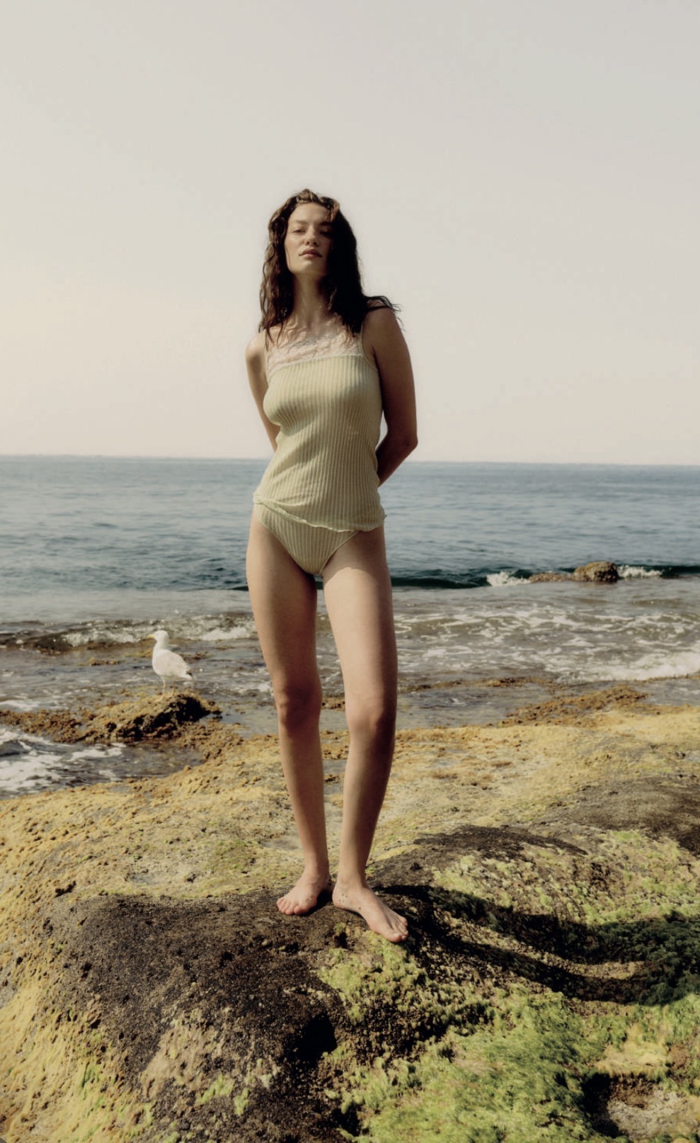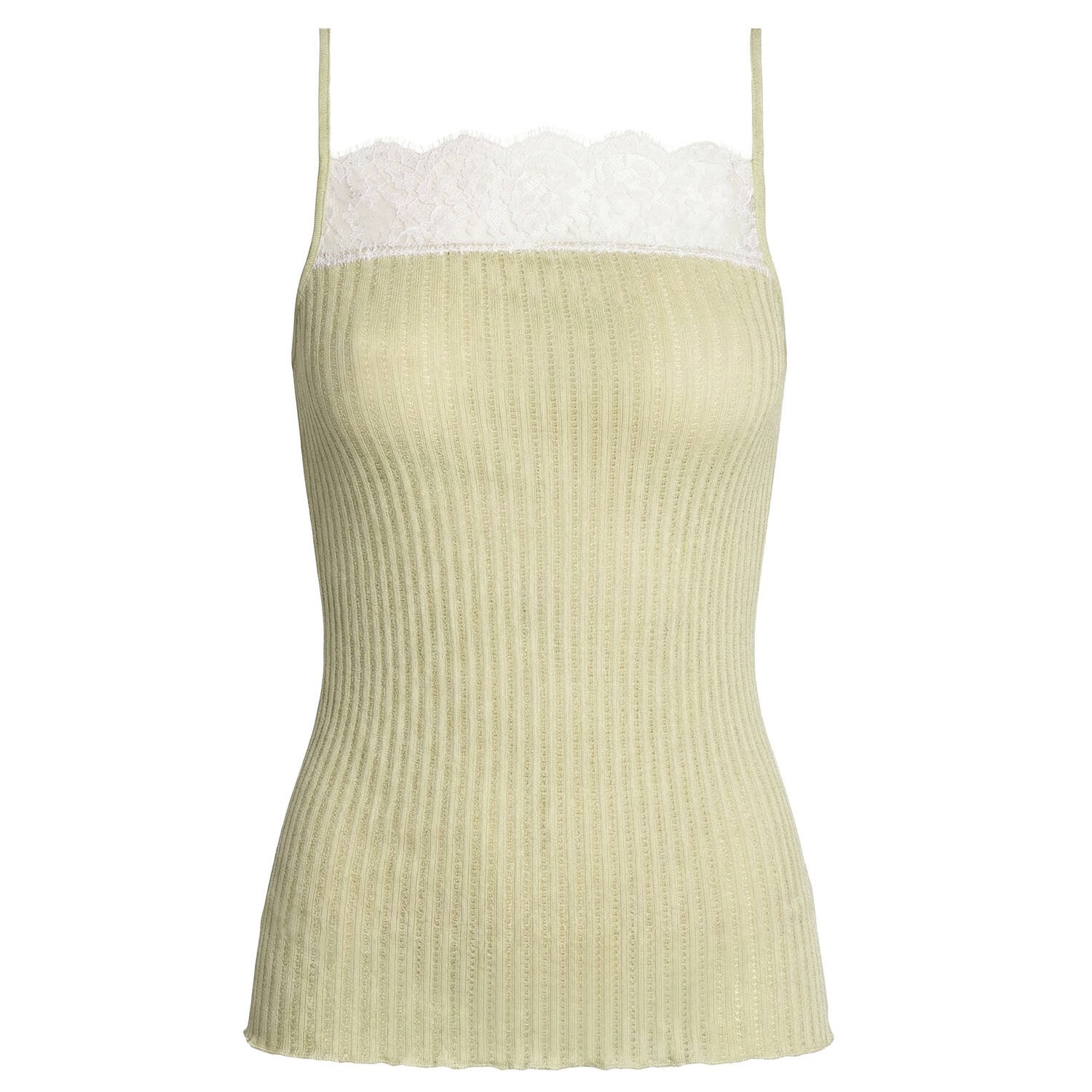純粋なエジプト産マコ綿(Filoscozia®)を使用した、繊細なアジュールリブ編みのキャミソールトップ。体に優しくフィットし、独特で上品な透け感が際立つ一着です。ストレートネックラインには、エレガントな花柄をあしらった洗練されたフレンチシャンティリーレースが施され、女性らしさを引き立てます。サイドシームのない構造により、肌に優しい肌触りと、体にフィットする最高の着心地を実現しています。