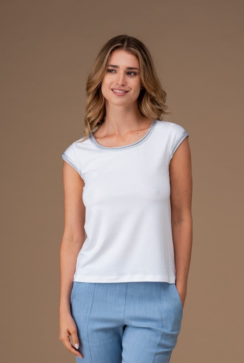 ルレックス縁取りのモダールコットン製クルーネックトップス