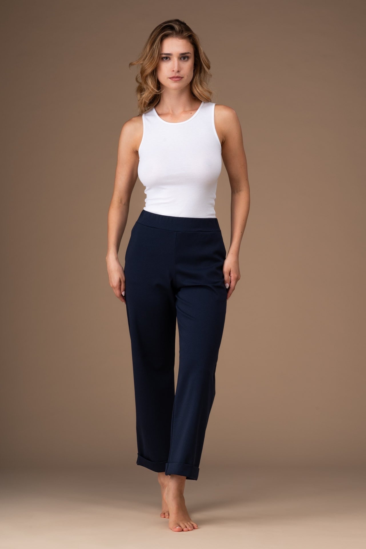 ローマポント素材の裾折り返し付きストレートパンツ。実用的で着回ししやすい一着です。