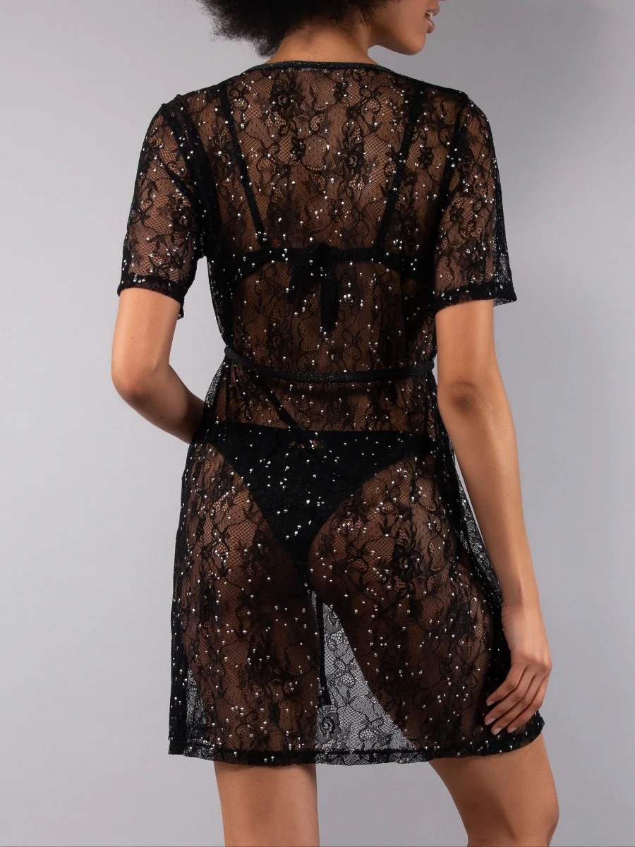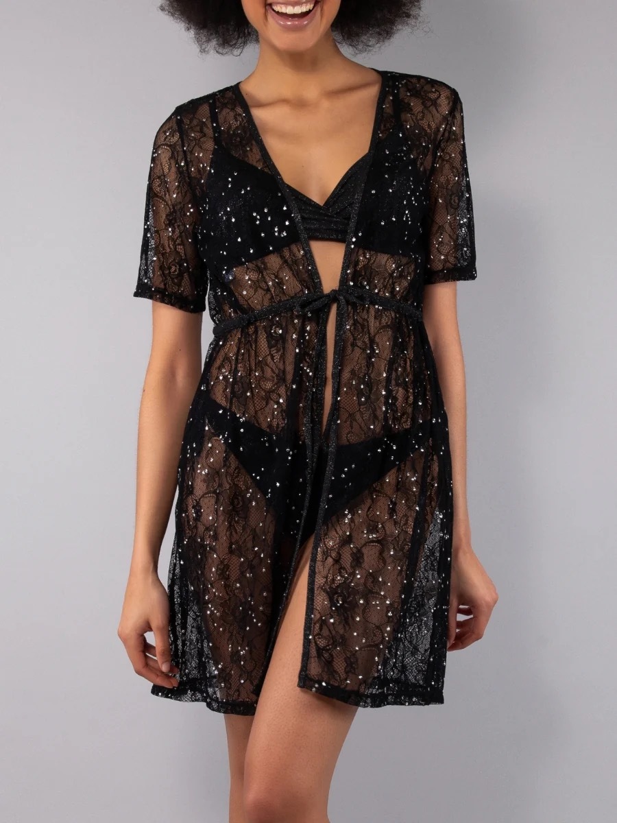 フロントが開いたショートカフタン。透け感のあるレース調の生地に花柄をあしらい、キラキラと輝くマイクロストーンを随所に散りばめて華やかに仕上げました。半袖デザインで、ウエストには調節可能な紐が付いており、開き具合を調整して自分好みのシルエットに整えることができます。ゆったりとした流れるようなシルエットで、非常に着心地が良く、着回しのきく一着です。アペリティフや散歩の際、ビーチスタイルに華やかなアクセントを加えるのに最適です。