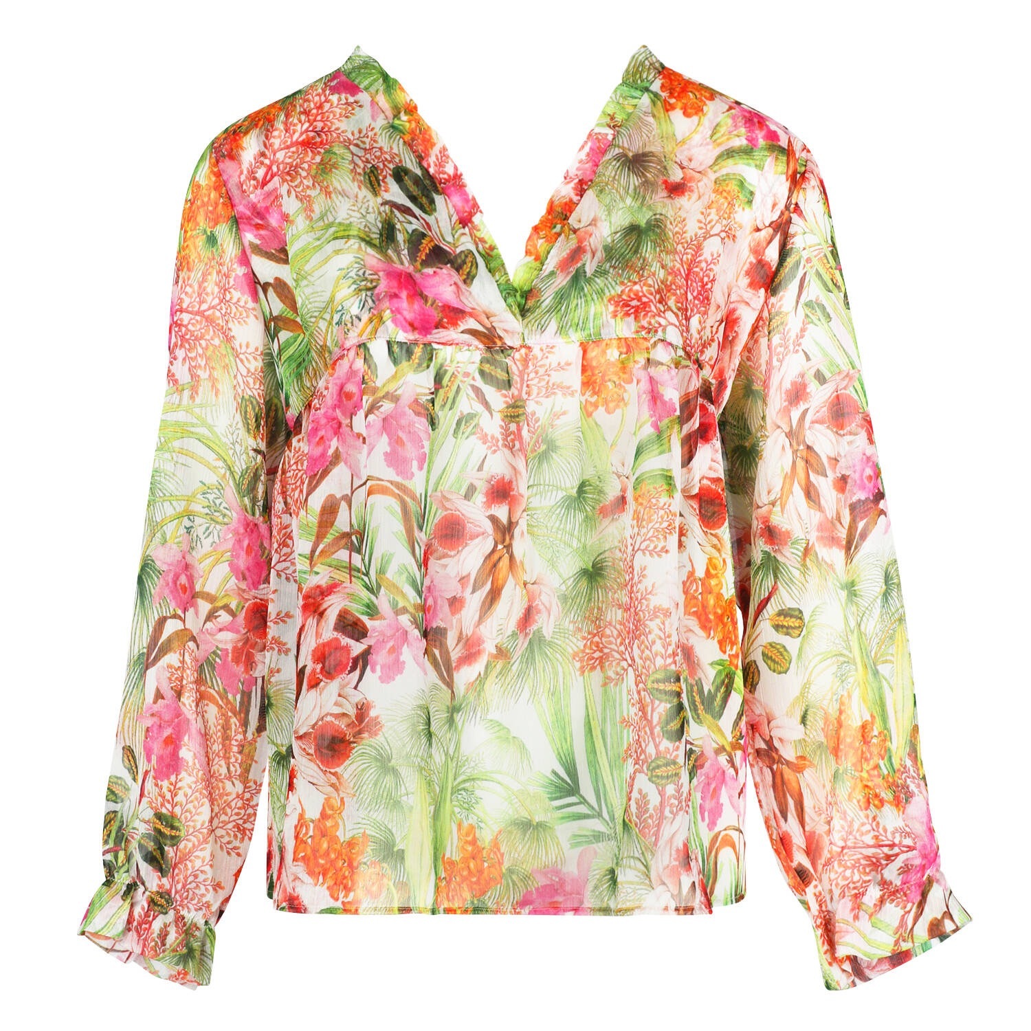 ゆったりとしたプリントクレープ素材のブラウス。前身頃と後ろ身頃に裏地付きのパネルが施され、Vネックラインには小さなフリル、袖口にはギャザーが入った長袖デザインです。