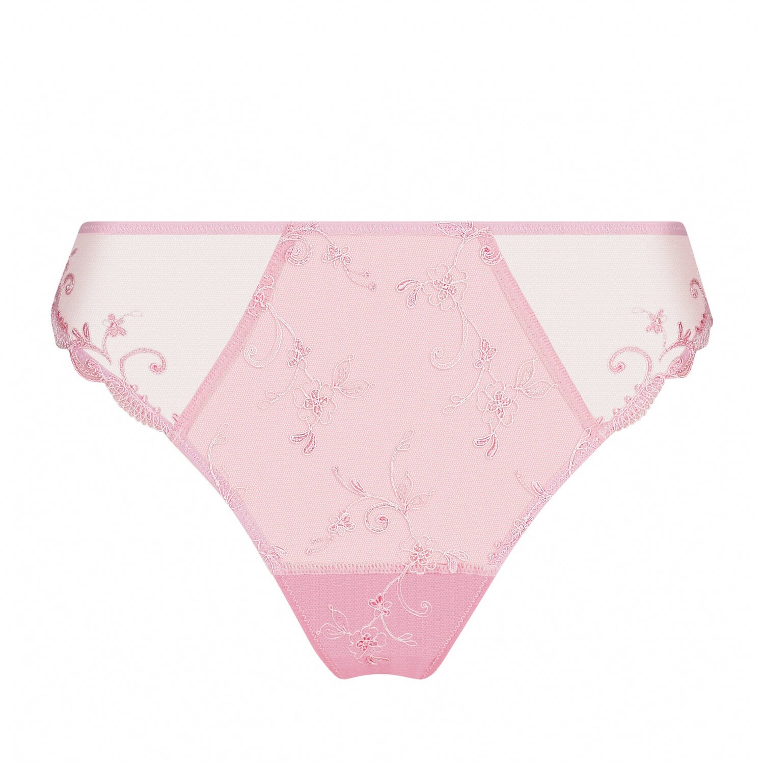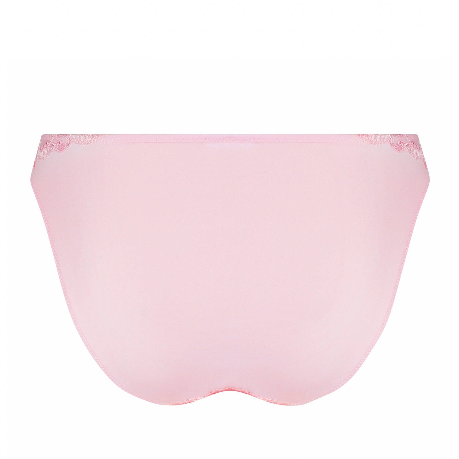 フロントの太もも部分から背中にかけてスカラップ模様の刺繍が施され、フロント中央にはそれに合わせた刺繍のレースがあしらわれたファンシーショーツ。